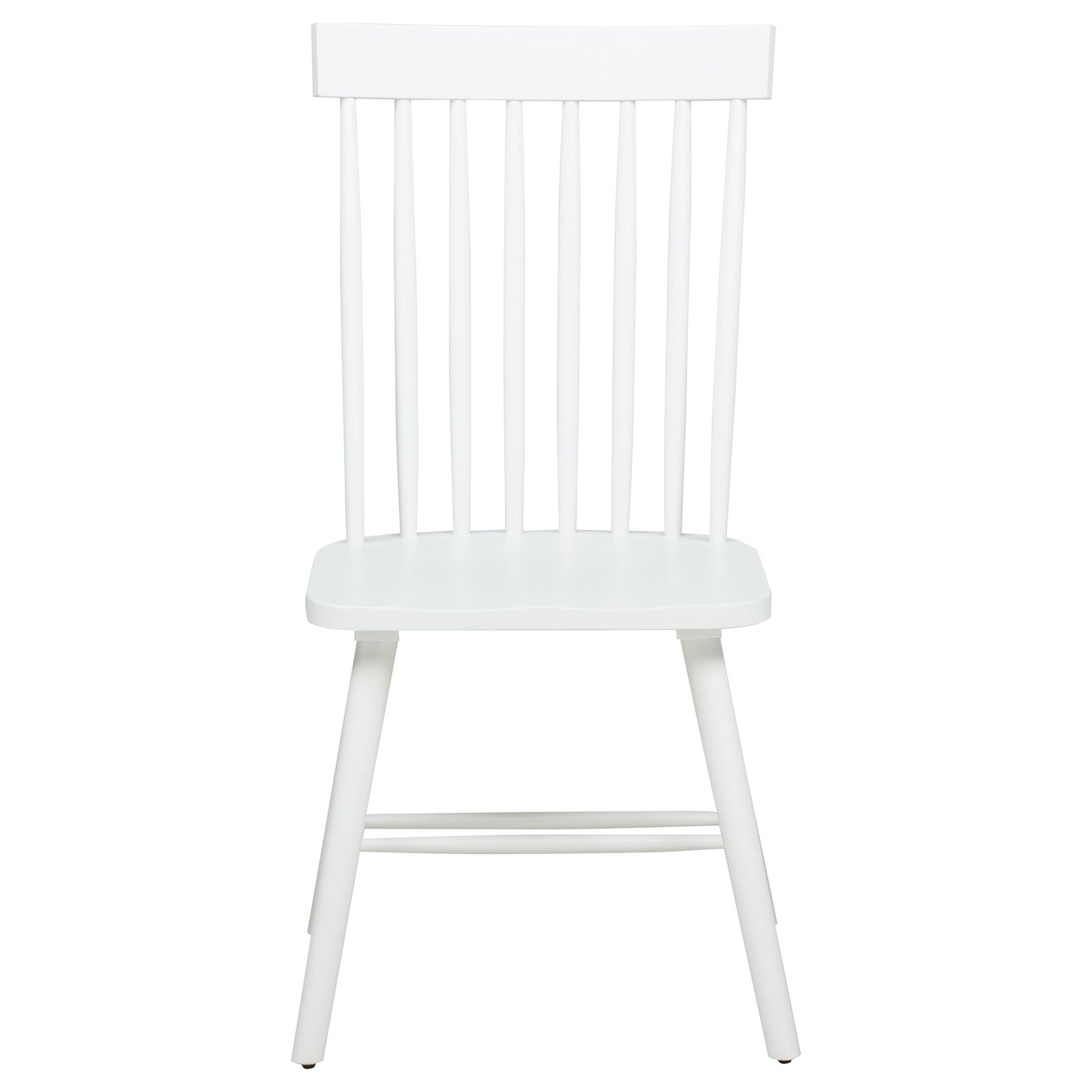 • Dining set includes rectangular table and Windsor-style chairs with warm two-tone finish, • Light ash tabletop pairs with tapered white legs for classic farmhouse contrast and charm, • White spindle back chairs offer tall support and contoured seats for long-lasting comfort, • Angled legs and stretcher supports enhance chair stability and balanced proportions, • Crafted from solid rubberwood, ash veneer, rubberwood veneer, and engineered wood, • Soft wood grain finish complements kitchen settings, dining rooms, or breakfast spaces