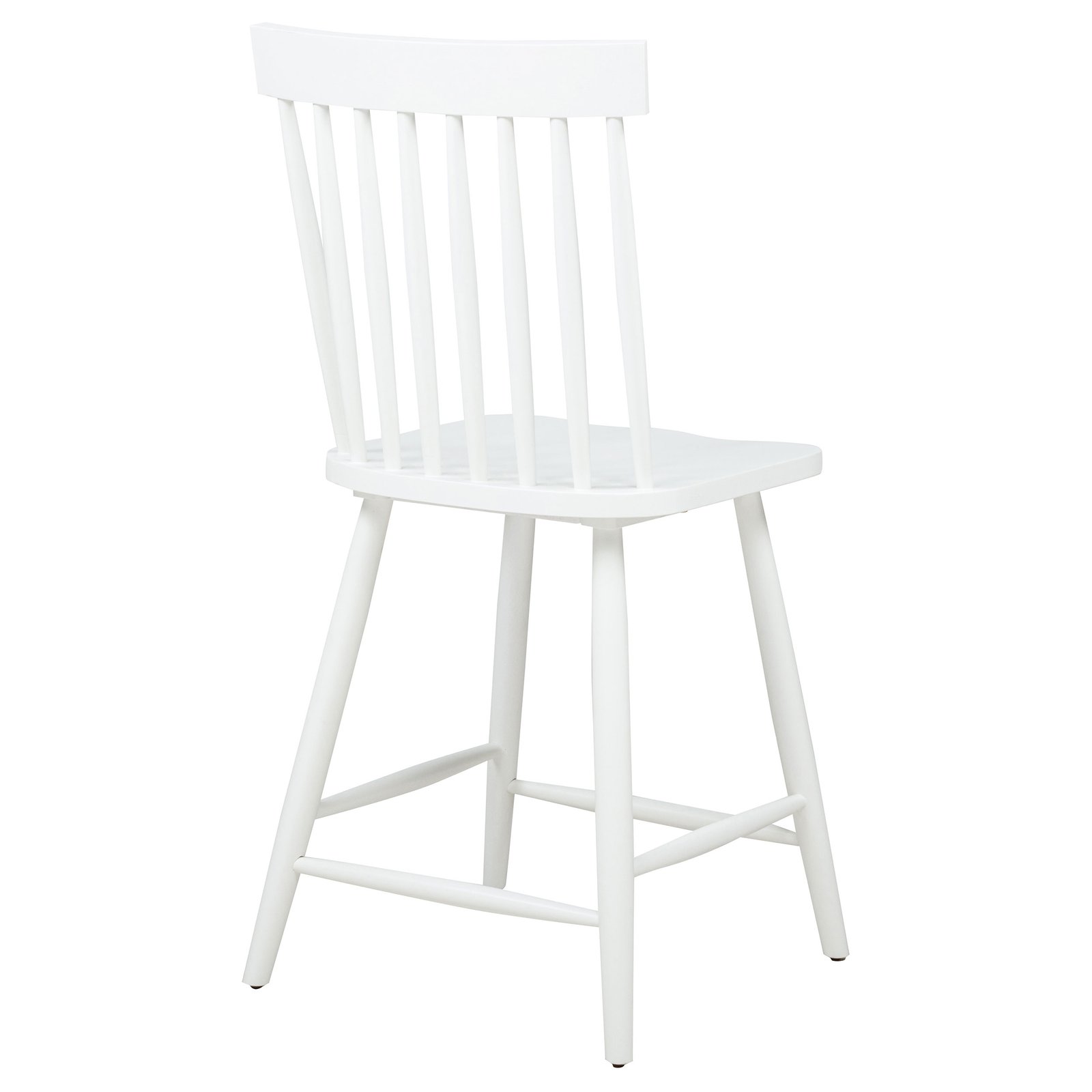 • Windsor-style counter height chair in white finish brings casual elegance to kitchen counters, • High spindle back and curved seat on this counter chair support relaxed, upright dining comfort, • Angled leg design adds stability while enhancing its signature farmhouse-style silhouette, • Footrest stretchers provide extra comfort and structural integrity for daily use, • Crafted from solid rubberwood and topped with a warm-toned wood veneer for natural appeal, • Clean, timeless lines and elevated height work perfectly with counter-height tables or bars