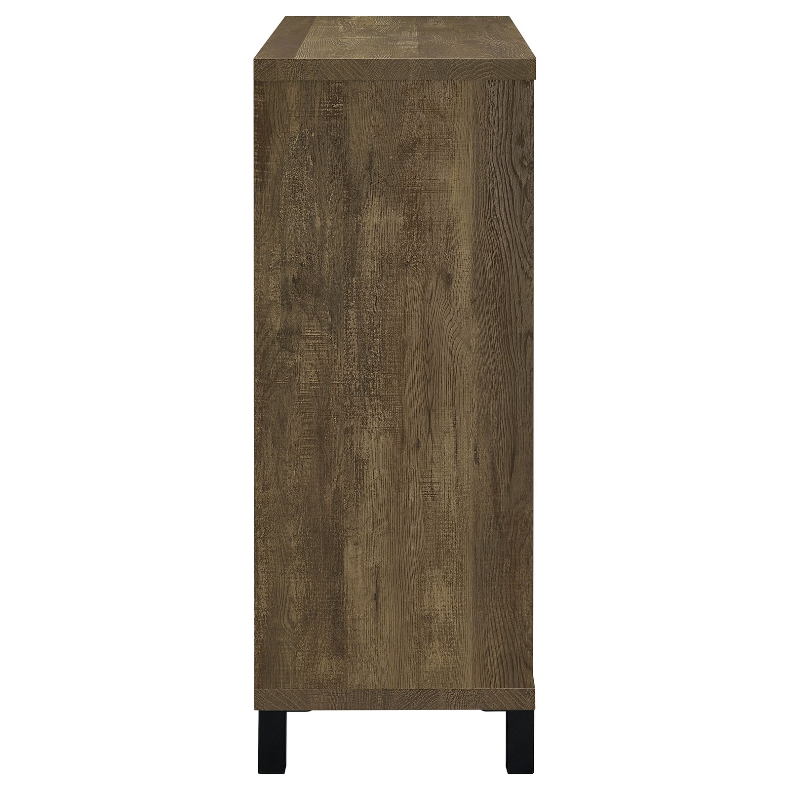 Perfect for a mountainside cottage or lakeside retreat, this bar cabinet features a rustic oak finish that is both handsome and charming. Place this bar cabinet in a rustic farmhouse home, as it offers a masculine rustic charm. It shows off a single sliding barn door that offers ample storage space and an adjustable shelf. In addition, this bar cabinet has two open shelves to display favorite decanters and barware, along with an eight bottle wine storage compartment. The wood designed chest is mounted on supportive, straight steel legs in a powder coated black finish.
