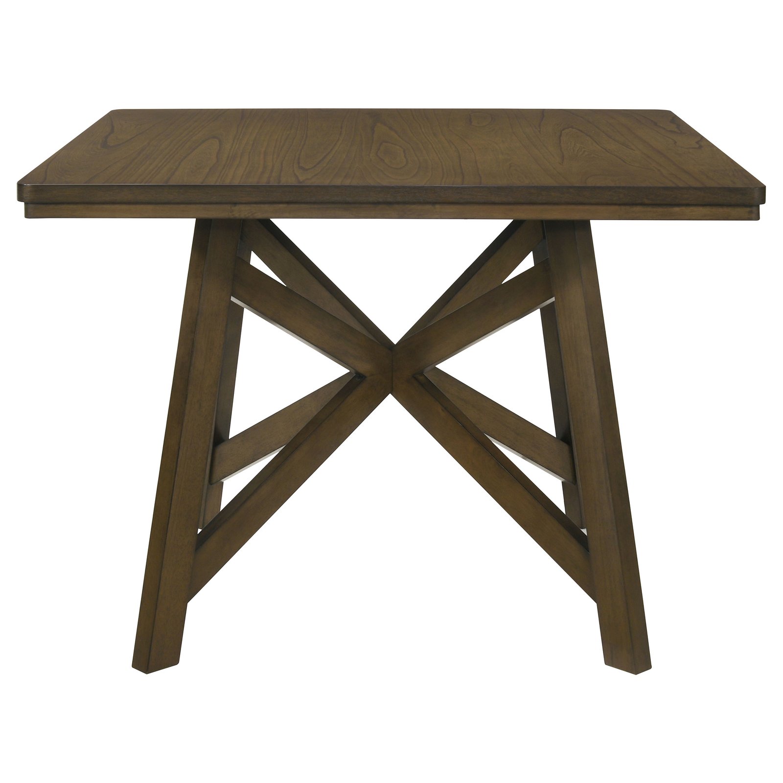 • 47-inch square counter height dining table in brown finish, • Crafted with engineered wood, hardwoods, and mindi veneer, • Mindi veneer striations add depth and natural character, • Sturdy construction ensures durability for everyday use, • Perfect for casual or formal dining spaces