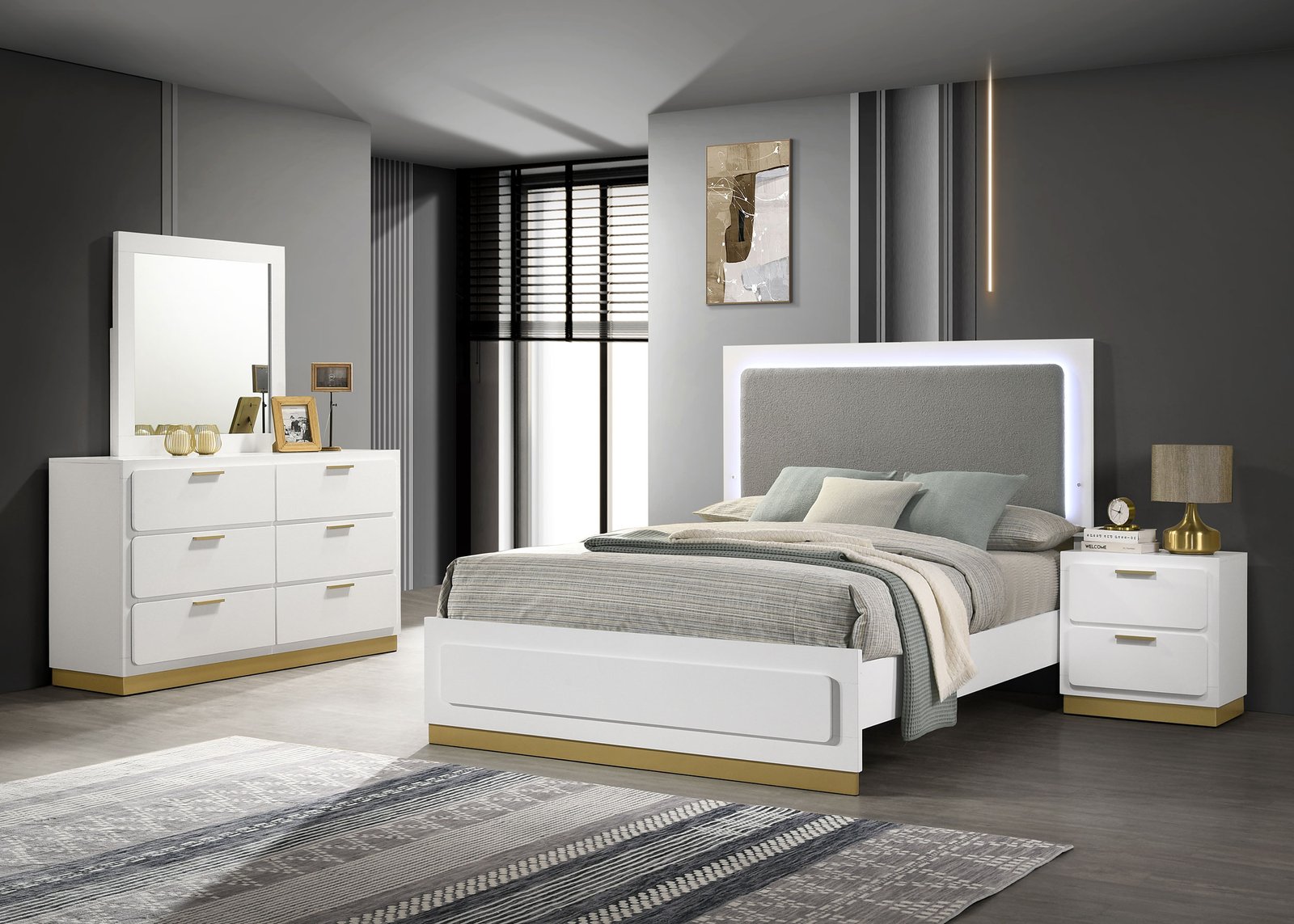 • Sleek white finish with a bold gold base adds a modern and elegant touch, • Crafted from rubberwood, engineered wood, and okume veneer for durability, • Bed features an LED headboard with a soft light grey upholstered panel, • Spacious drawers provide convenient and organized bedroom storage options, • Gold-finished handles enhance the refined and contemporary aesthetic, • A stylish and functional bedroom set designed for modern living spaces