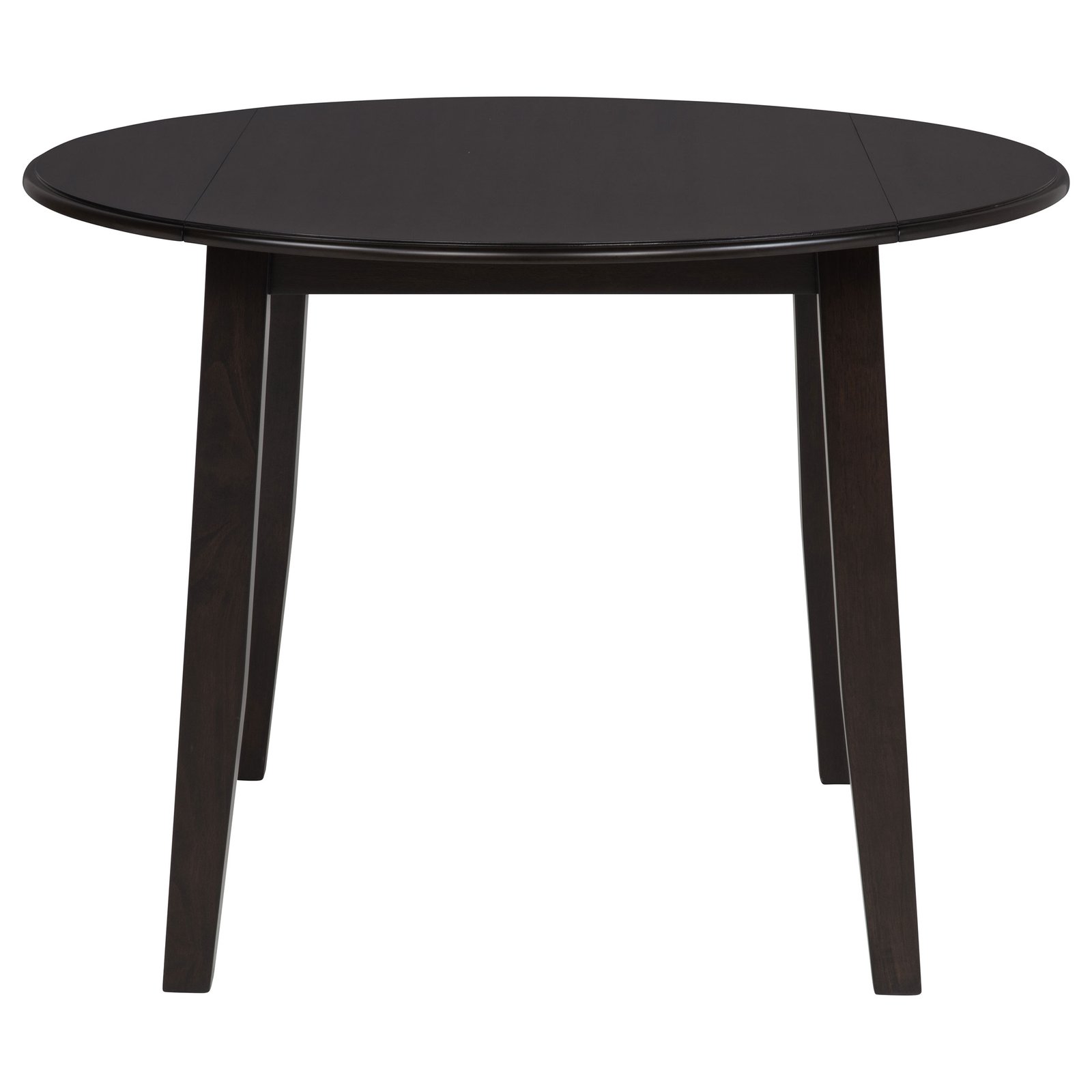 • Five-piece round dining set with drop-leaf table for casual and expanded dining use, • Dark coffee wood finish lends richness and warmth to compact dining spaces, • Drop-leaf top folds down to conserve space when not in use, • Chairs feature gently curved backs and soft cushioned seats in ivory fabric, • Crafted from rubberwood, mango, engineered wood, foam, and fabric upholstery, • Perfect for cozy kitchen corners, apartments, or breakfast nooks