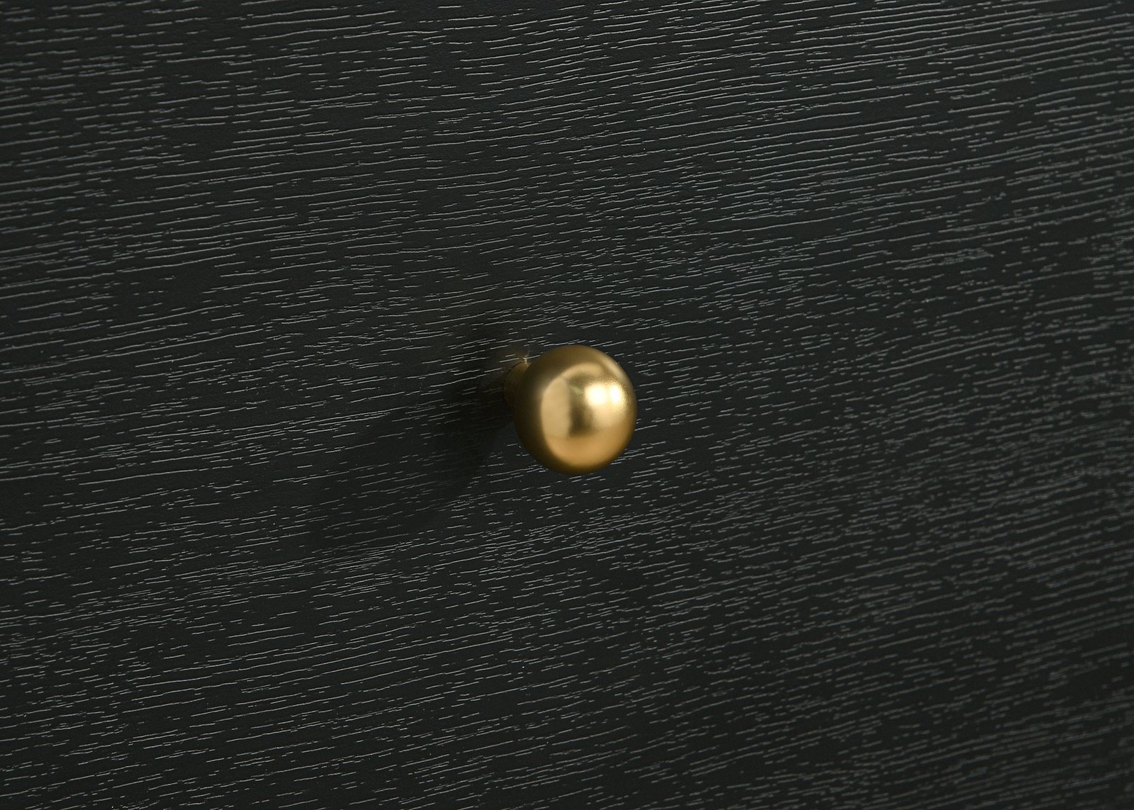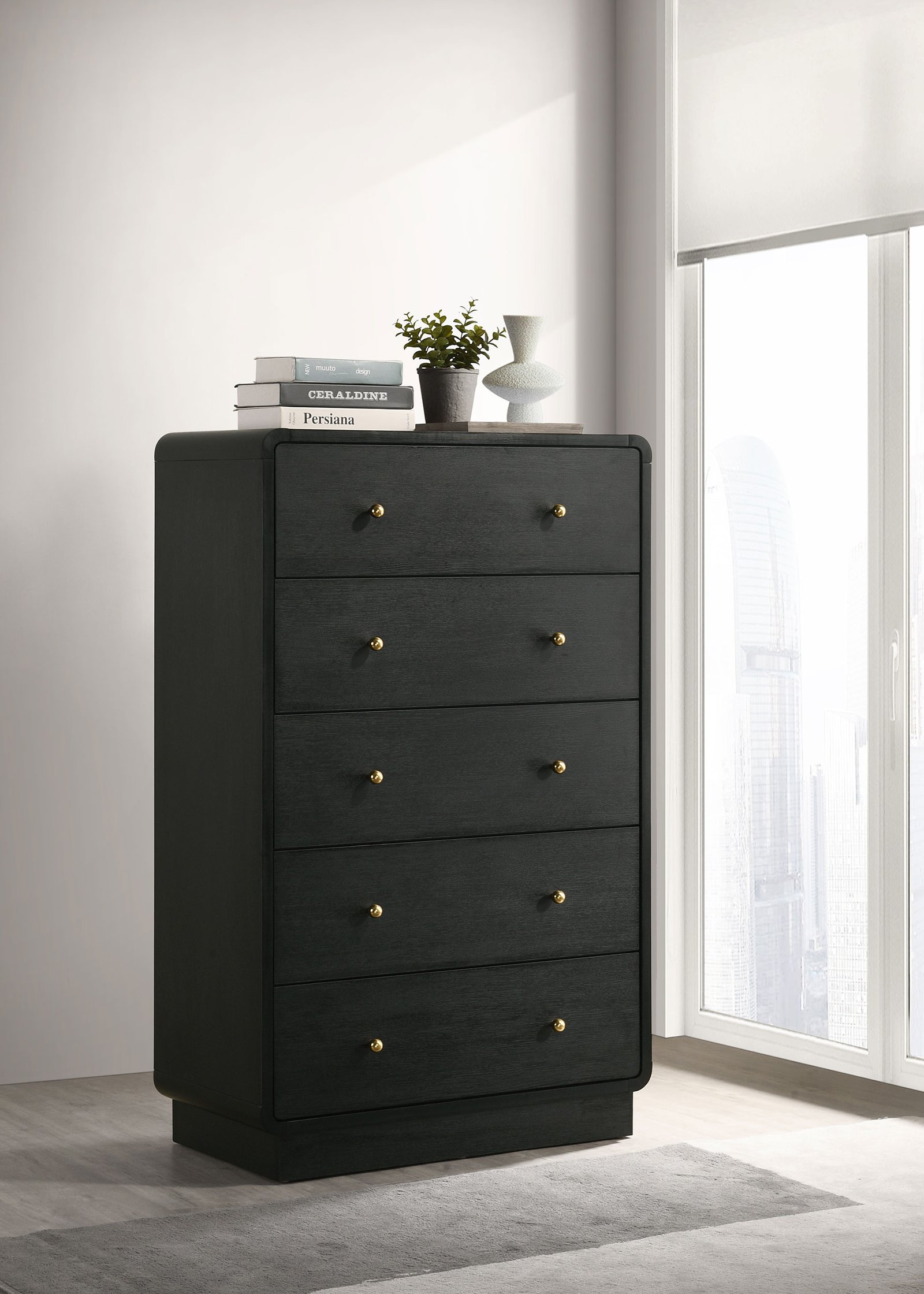 • A modern five-drawer chest provides plentiful bedroom storage and stylish allure, • Features a black finish frame with rounded corners that create an inviting presentation, • Charming petite ball knobs receive a brass finish, adding glamour and contrasting dimensionality, • Made with melamine veneer that resists scratches and dents for excellent longevity and performance, • Drawers feature metal extension glides for seamless performance and operation