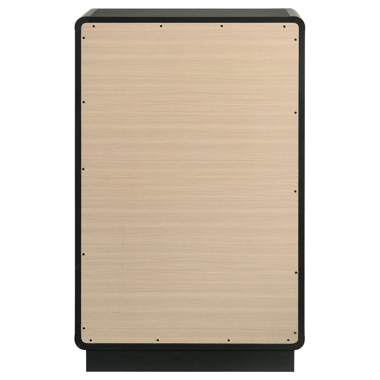 Create a dedicated space for clothing and accessory storage with this modern five-drawer chest. Its sophisticated presentation is complemented with a black finish over durable melamine surfaces, resisting damage to maintain its fresh, clean aesthetics. Each drawer front is dotted with a pair of ball knobs, offering seamless performance and a refined, glam touch of character. The chest features a rounded silhouette, softening the dark black finish, while adding to its modern appeal. Add art to its roomy top to create a truly eye-catching accent piece in your bedroom.