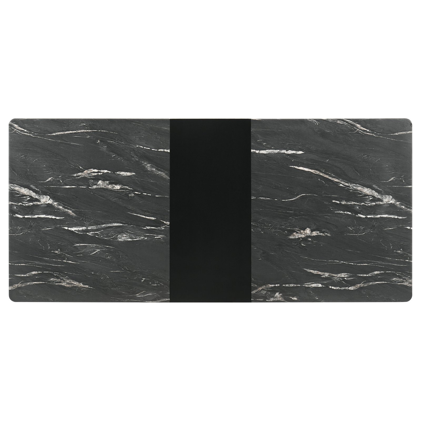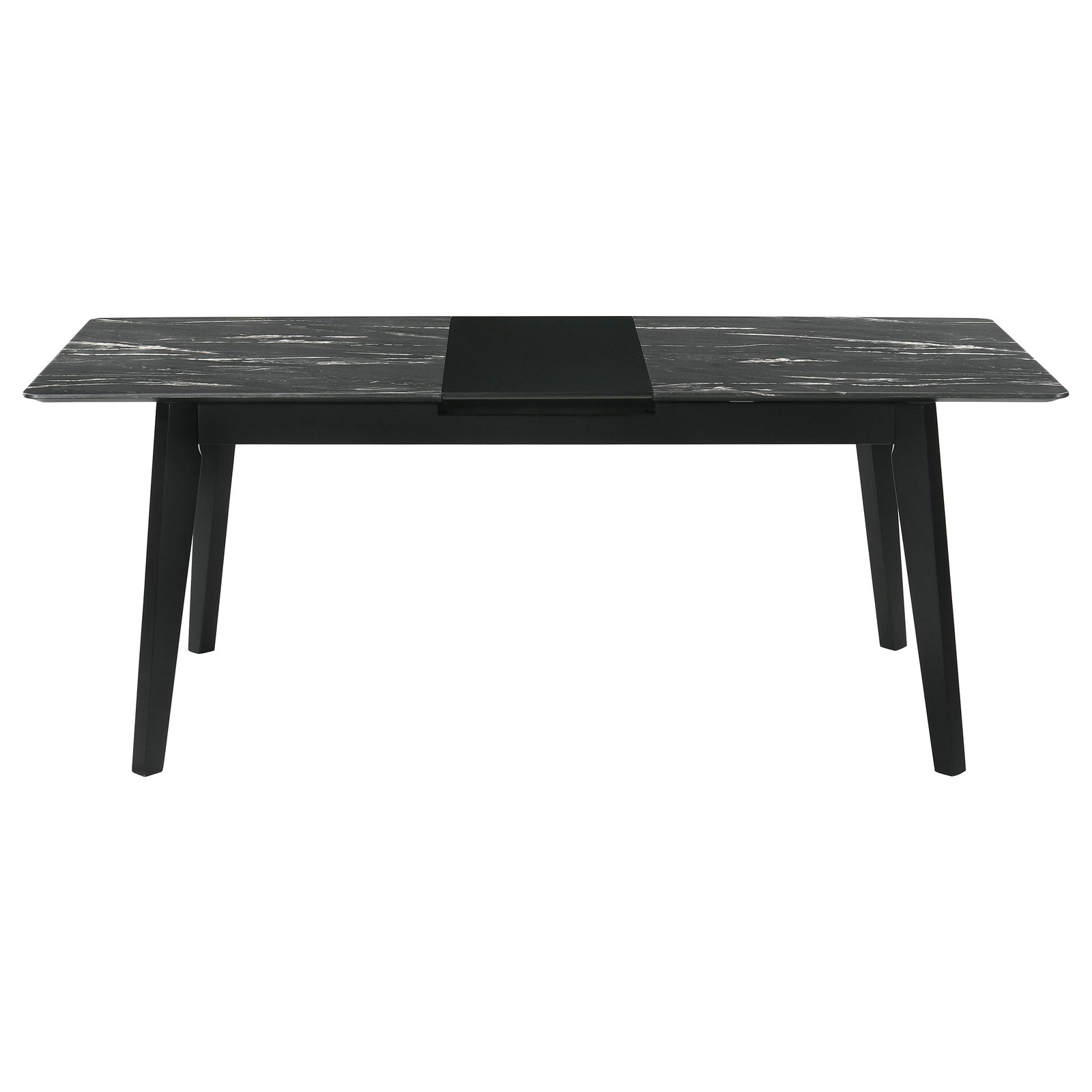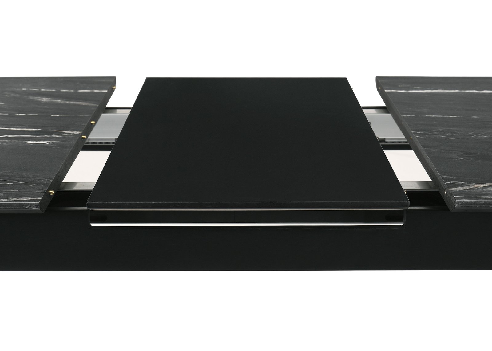 The luxurious look of faux marble creates a glam sensibility for a modern dining table. The black marble look of the tabletop complements a sleek base with fin-style legs and a recessed apron. The table includes a self-storing leaf for easy expansion to accommodate guests or the family. Its black base finish is crisp and classic, offering timeless elegance that never goes out of style. It’s the perfect way to bring fresh, modern energy to your dining room.
