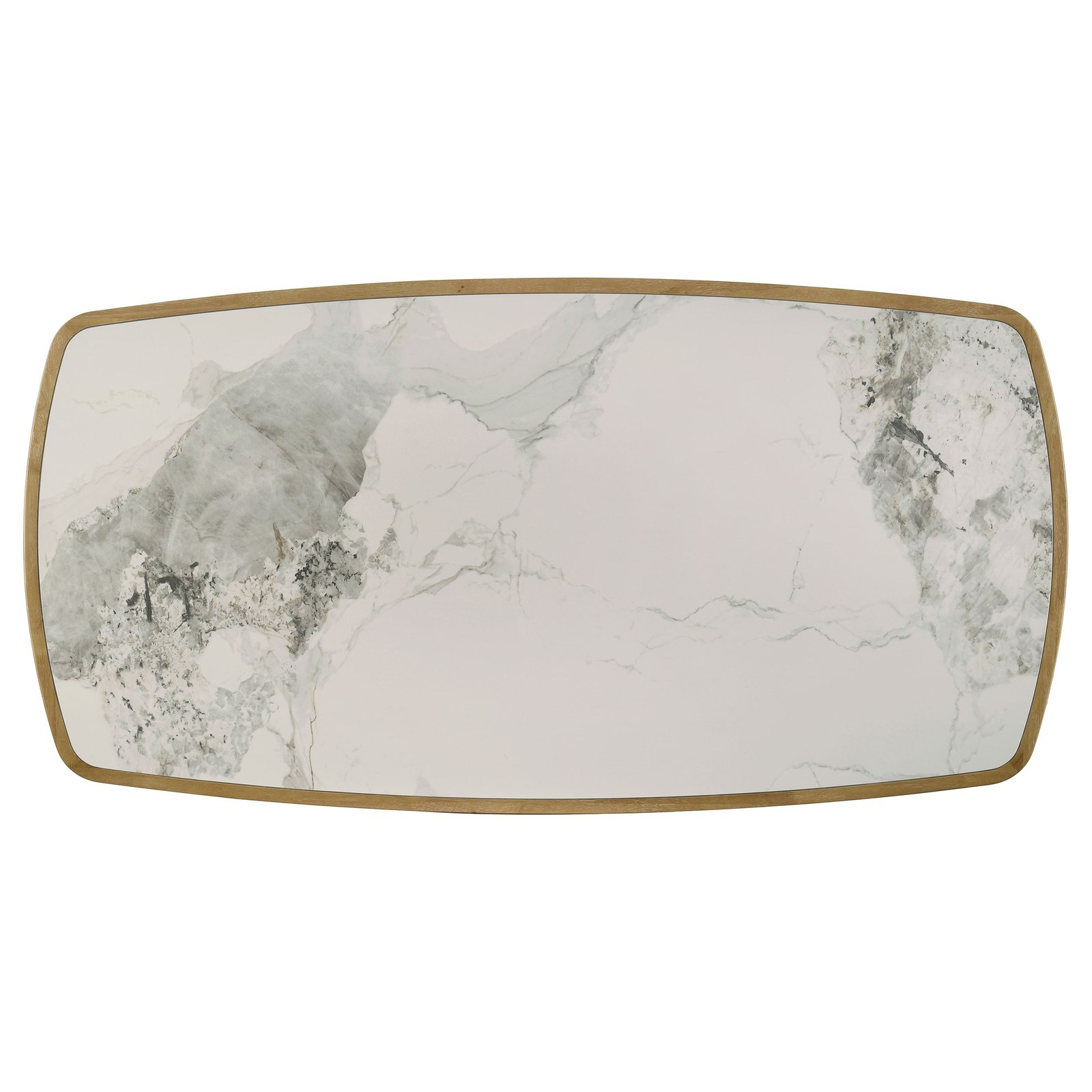 This mid-century inspired dining table blends sculptural elegance with modern innovation. The rectangular tabletop features a recessed ceramic inlay with natural marbling in tones of off white, grey, and amber brown, resistant to heat and stains with an impermeable, easy-clean surface. A softly curved solid wood frame in weathered natural finish surrounds the top, supported by angular legs with slatted stretchers for added character. Crafted from rubberwood and durable composites, it seats six comfortably for everyday dining.