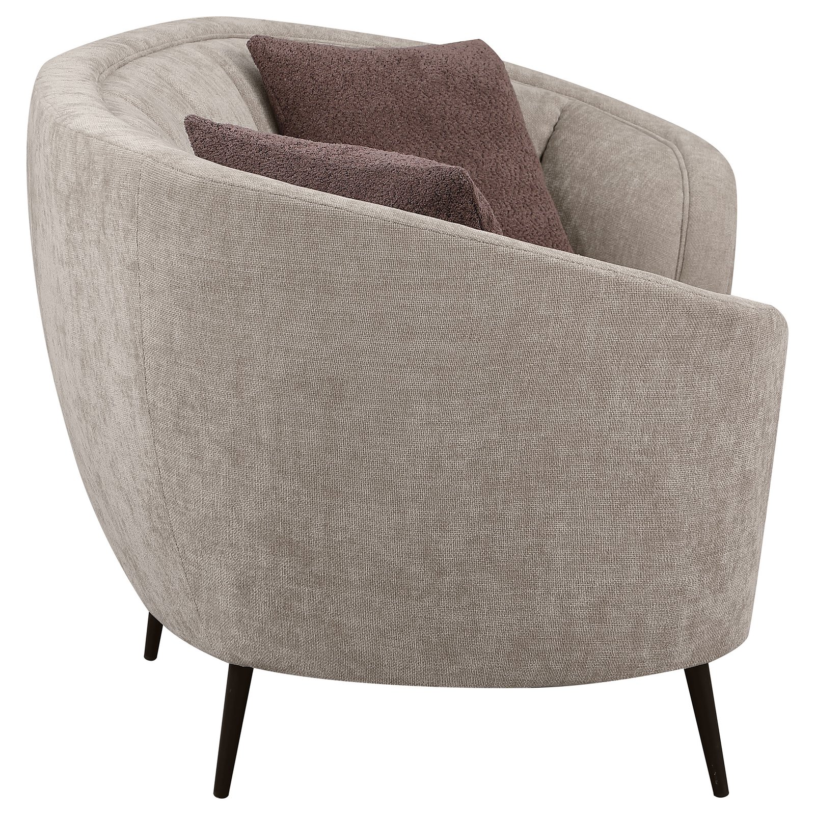 Show off your curve appeal with this updated kidney silhouette that blends fresh appeal and timeless elegance in a modern loveseat. This great piece, featuring soft, neutral beige upholstery, is perfect to float in the center of a room as an attractive focal point. The loveseat’s curvy profile is complete with a rounded back and arms with a sloping design, framed by extra wide channel details, lending a sense of sophistication in a den or living room. A pair of premium filled accent pillows featuring a wide corduroy stripe and plum textured boucle offer impeccable comfort for lounging. The loveseat stands on stylish tapered black powder coated metal legs, providing a lovely hint of vintage character and airy height.