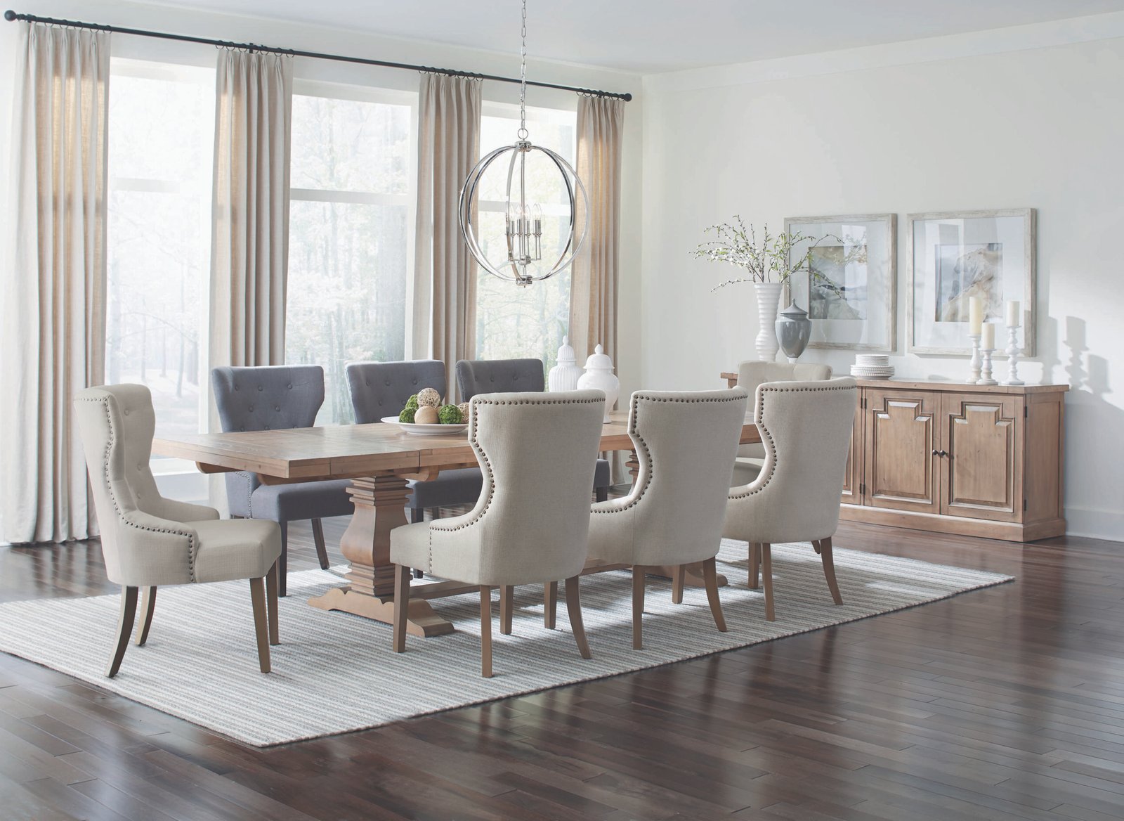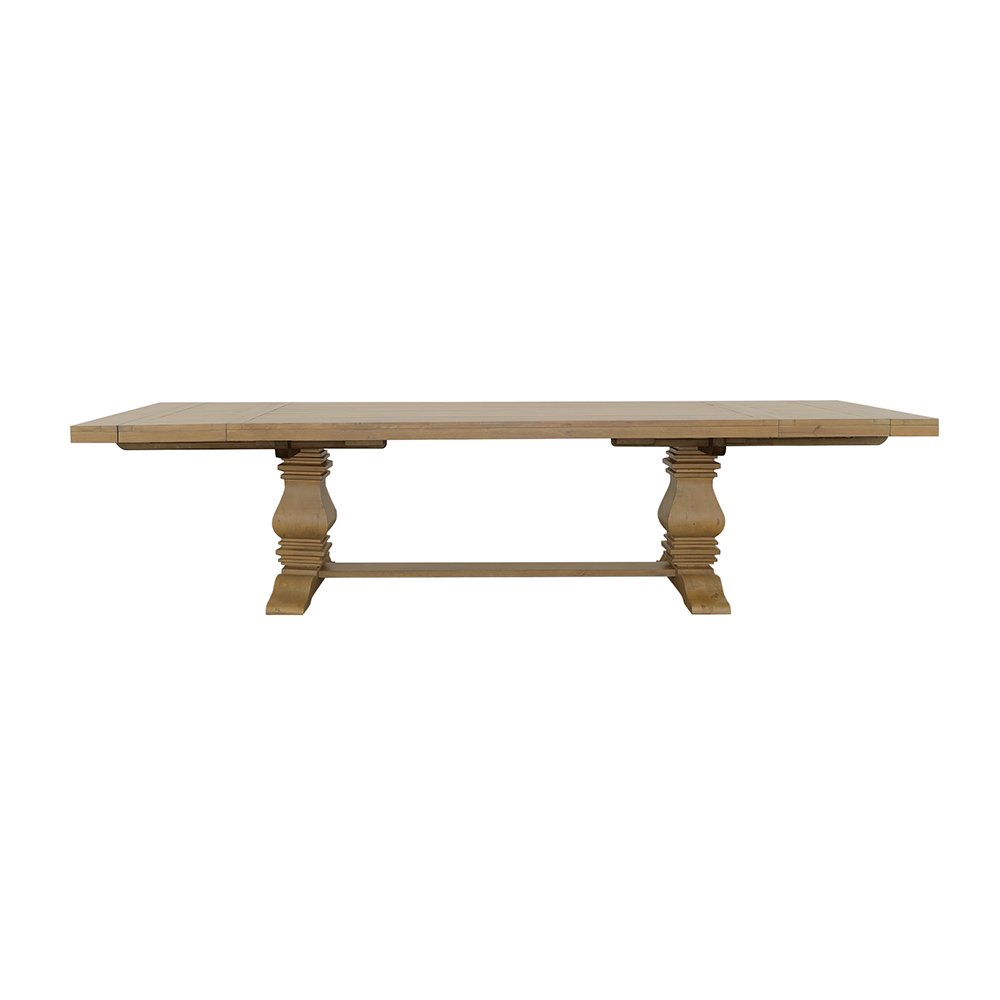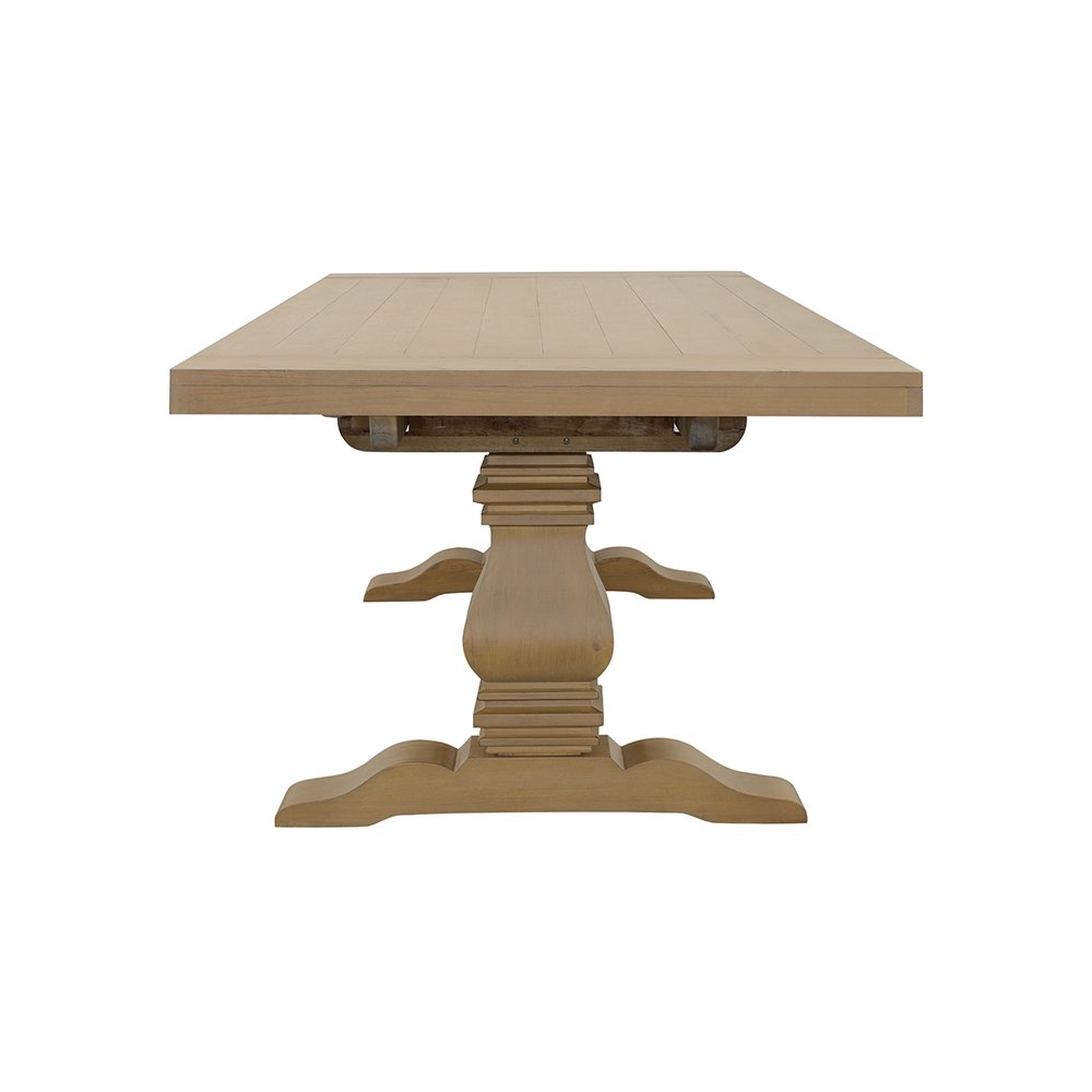 This rectangular extension dining table blends classic European elegance with artisan craftsmanship. Crafted from solid pine, it features a double pedestal trestle base that exudes romantic charm and timeless character. The sculpted pedestals, connected by a wide plank accent, create a striking focal point with an authentic handcrafted feel. A planked tabletop enhances its rustic appeal, while two 16-inch removable leaves extend the table up to 126 inches, making it perfect for gatherings large and small. Built for both beauty and durability, this table is an inviting centerpiece for any dining space.