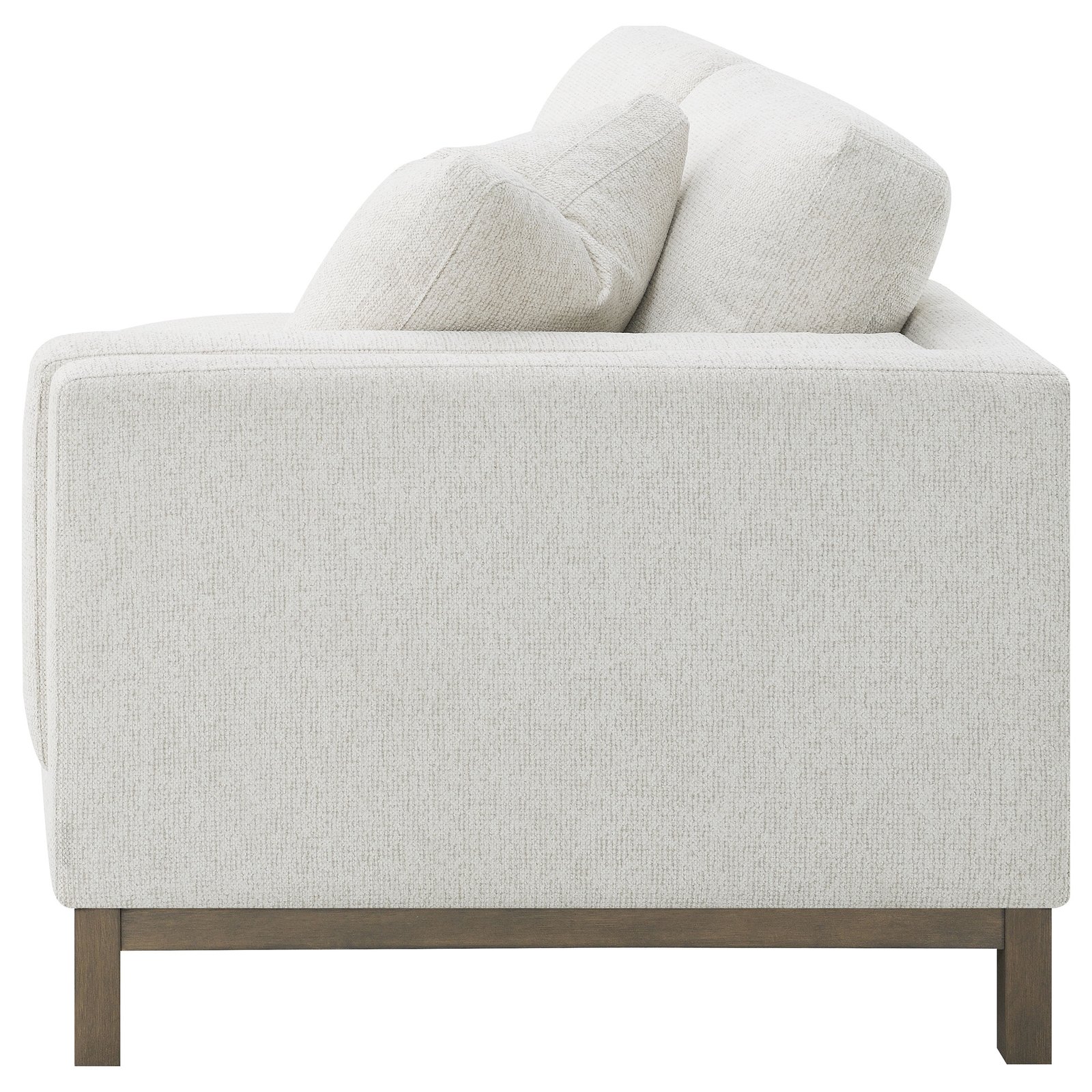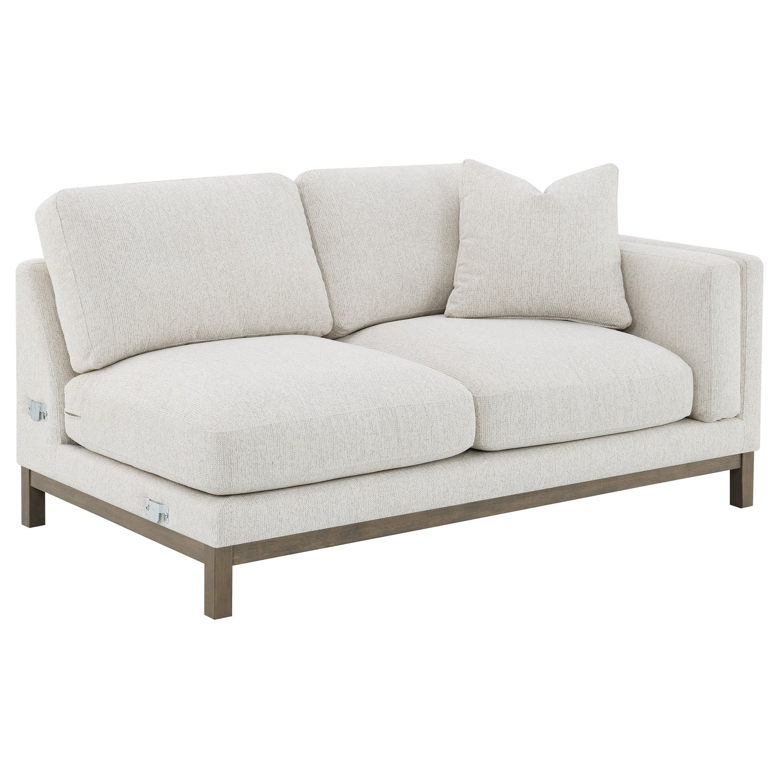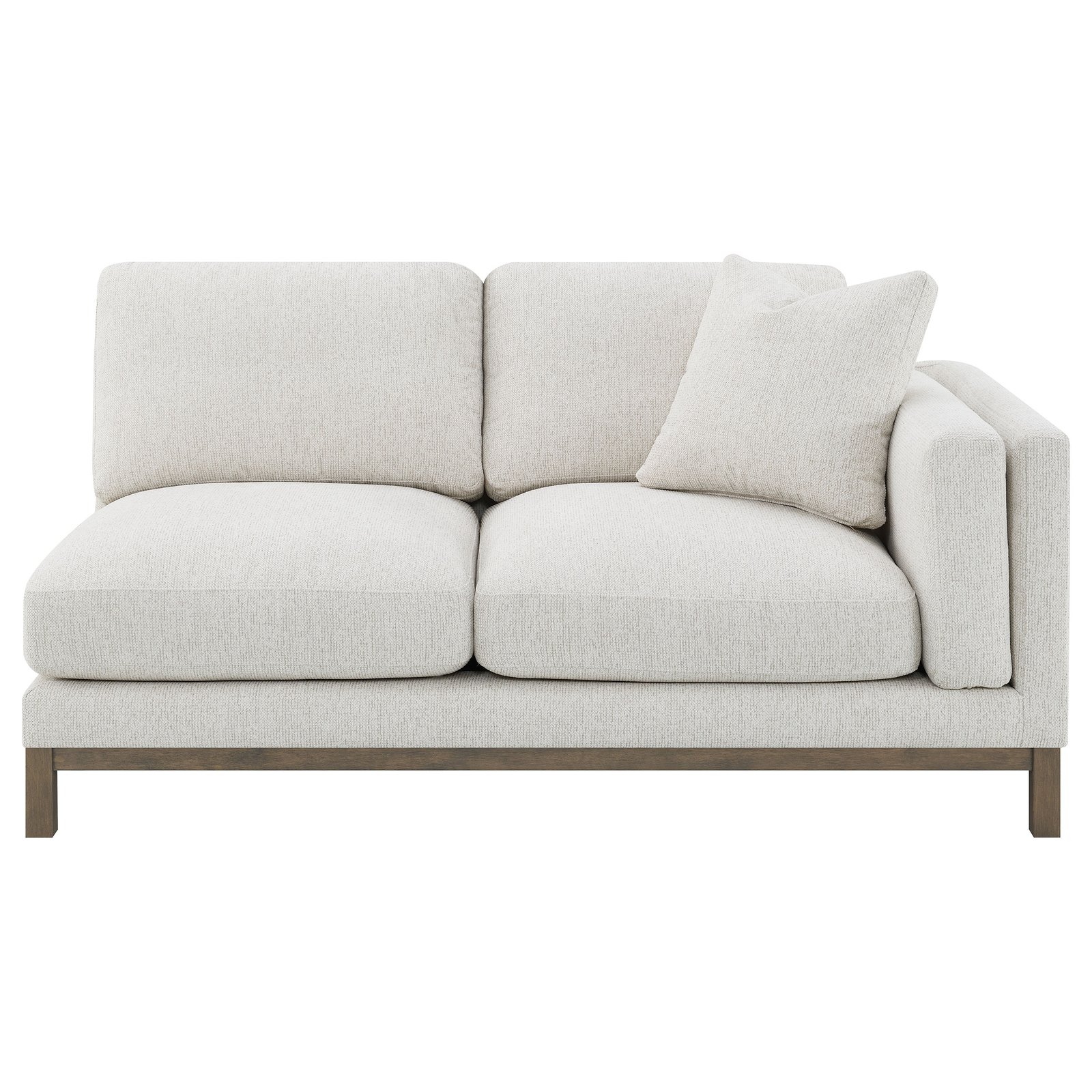 Indulge in the inviting comfort of this modern sectional sofa, thoughtfully designed with a left side chaise to accommodate your personal lounging preferences. Upholstered in a soft, textured fabric, complemented with a solid wood pedestal base in ash brown, creating the perfect stylish seating foundation. Fulling encased engineered wood frame, sinuous spring seating and foam combined with premium blend fill create a plush, resilient feel. Complete with reversible back cushions, reversible single cushions, removable chaise cushion and coordinating accent pillows, this sectional becomes the stylish focal point of a welcoming, contemporary living room.