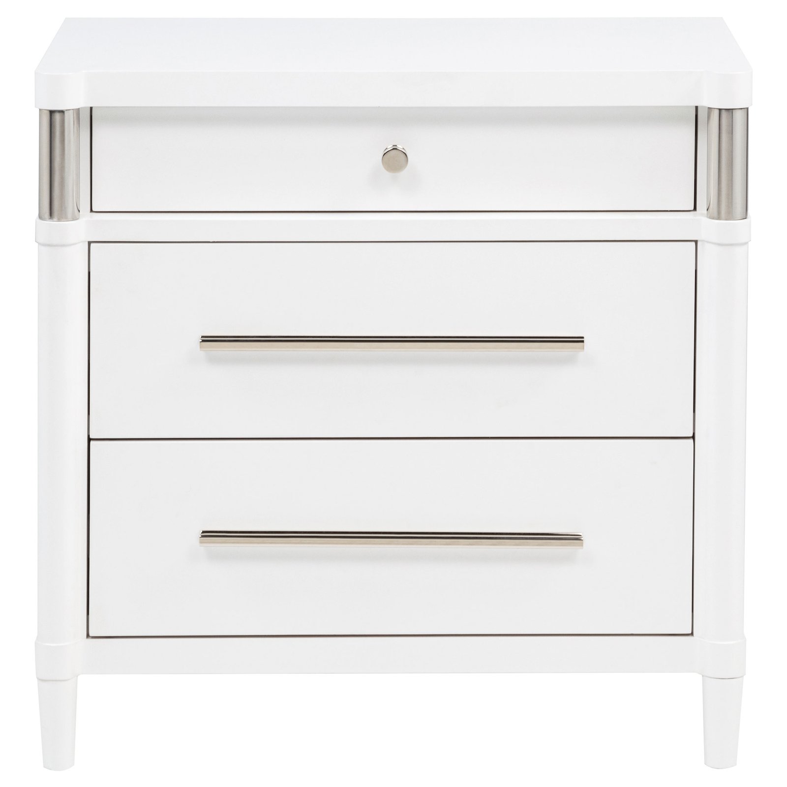 • Three-drawer nightstand with curved edges and clean profile for modern bedside storage, • White finish pairs with brushed nickel pulls and sleek vertical tube accents, • Top drawer includes felt lining, tinted interior, and hidden cord access for charging, • Drawer boxes feature dovetail joints and glide on 45mm heavy-duty metal runners, • Built from solid rubberwood, engineered wood, and smooth laminate veneer, • Fully assembled nightstand includes tip-over restraint for dependable bedside use