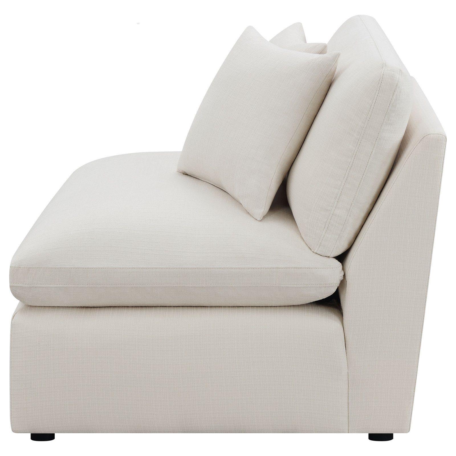 This armless chair combines plush cushioning with versatile design, making it a stylish and comfortable addition to any living room. Upholstered in soft fabric, it offers a supportive seat and back for everyday lounging. Clean lines and tailored topstitching create a contemporary look, while treated upholstery resists moisture for easier cleanup and long-lasting appeal. With its refined silhouette and cozy construction, this chair brings both comfort and style to your home.