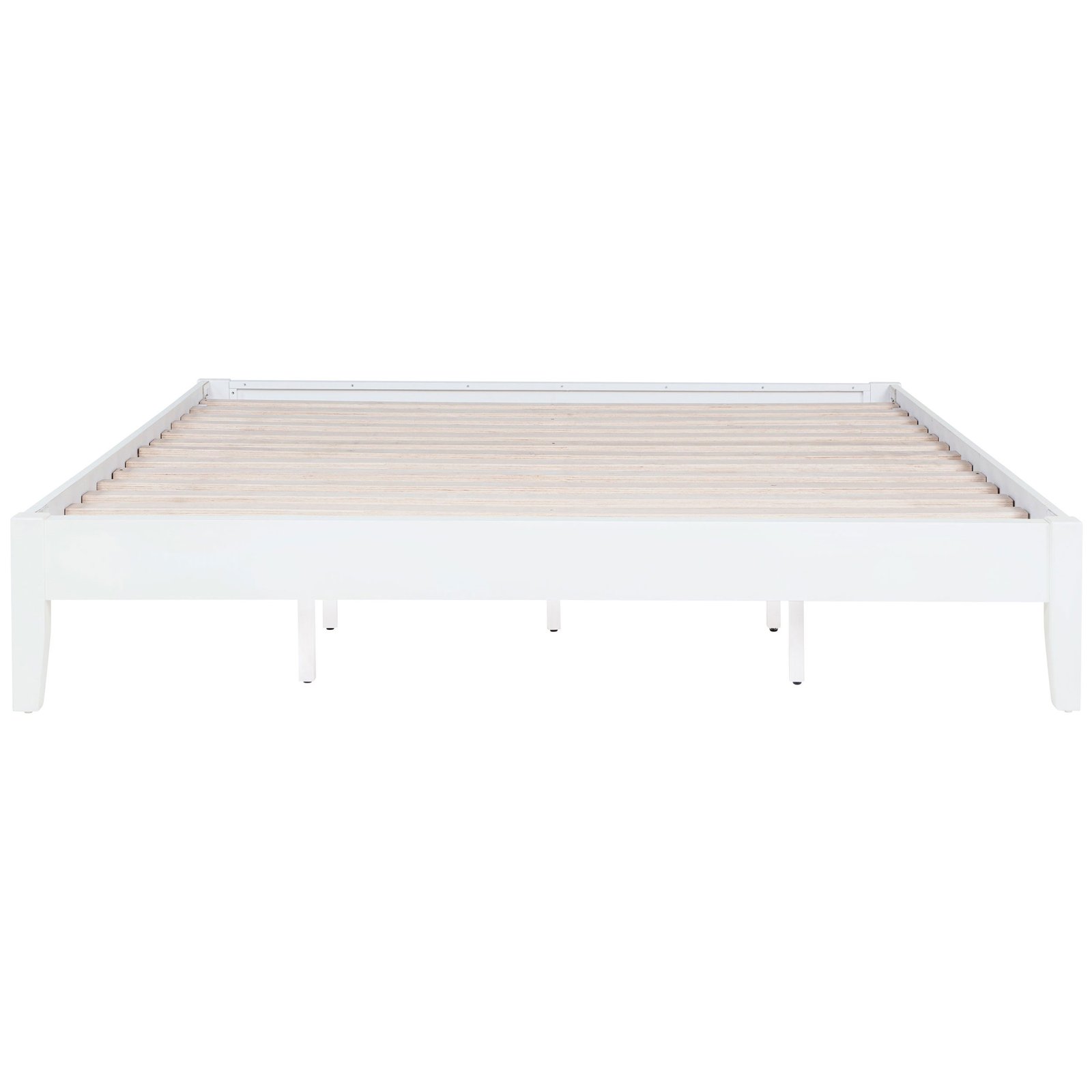 • Universal platform bed showcasing a crisp and modern white finish, • Fully slatted, mattress-ready frame eliminates the need for a box spring, • Durable rubberwood and pine construction ensures long-lasting support, • Pre-drilled holes on back legs allow simple headboard customization, • Tapered legs enhance the clean-lined silhouette with subtle detail, • Perfectly suited for a variety of bedroom aesthetics and decor styles