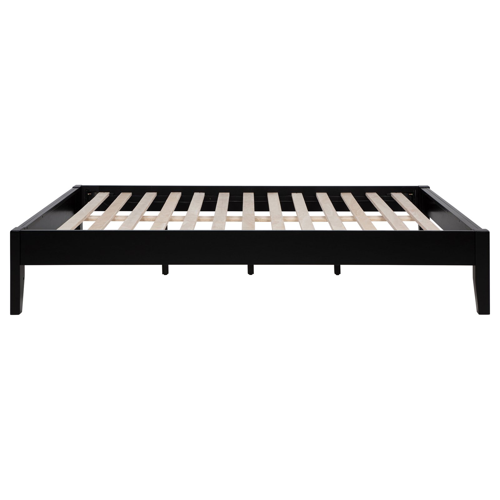 • Universal platform bed with a sleek, modern black finish, • Fully slatted, mattress-ready design requires no box spring, • Constructed from durable rubberwood and pine for lasting stability, • Pre-drilled holes on back legs allow for easy headboard attachment, • Tapered legs add a subtle design element to the streamlined frame, • Ideal for various bedroom styles with its versatile, minimalist appeal
