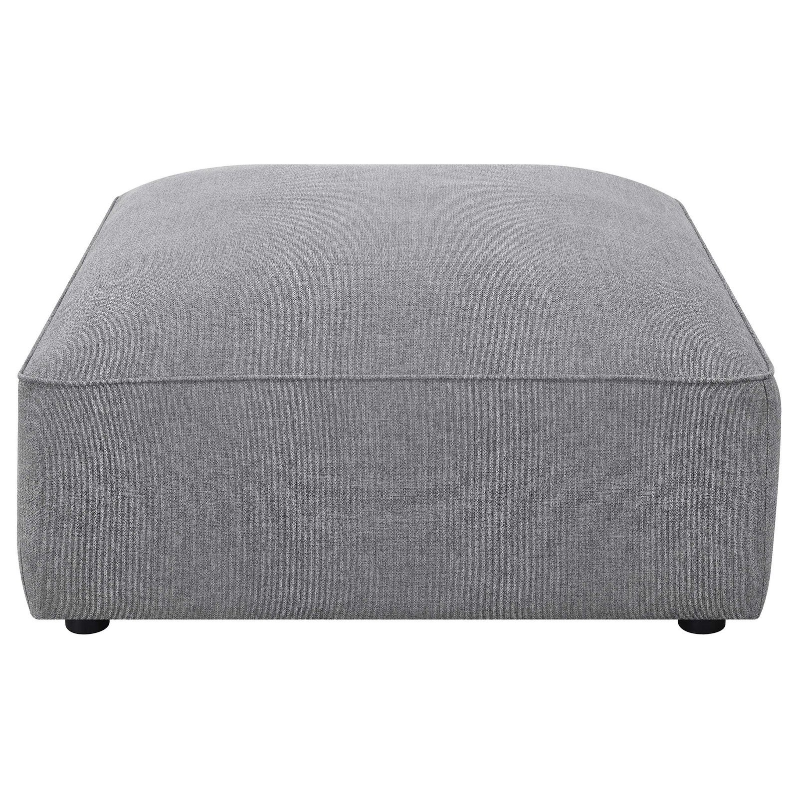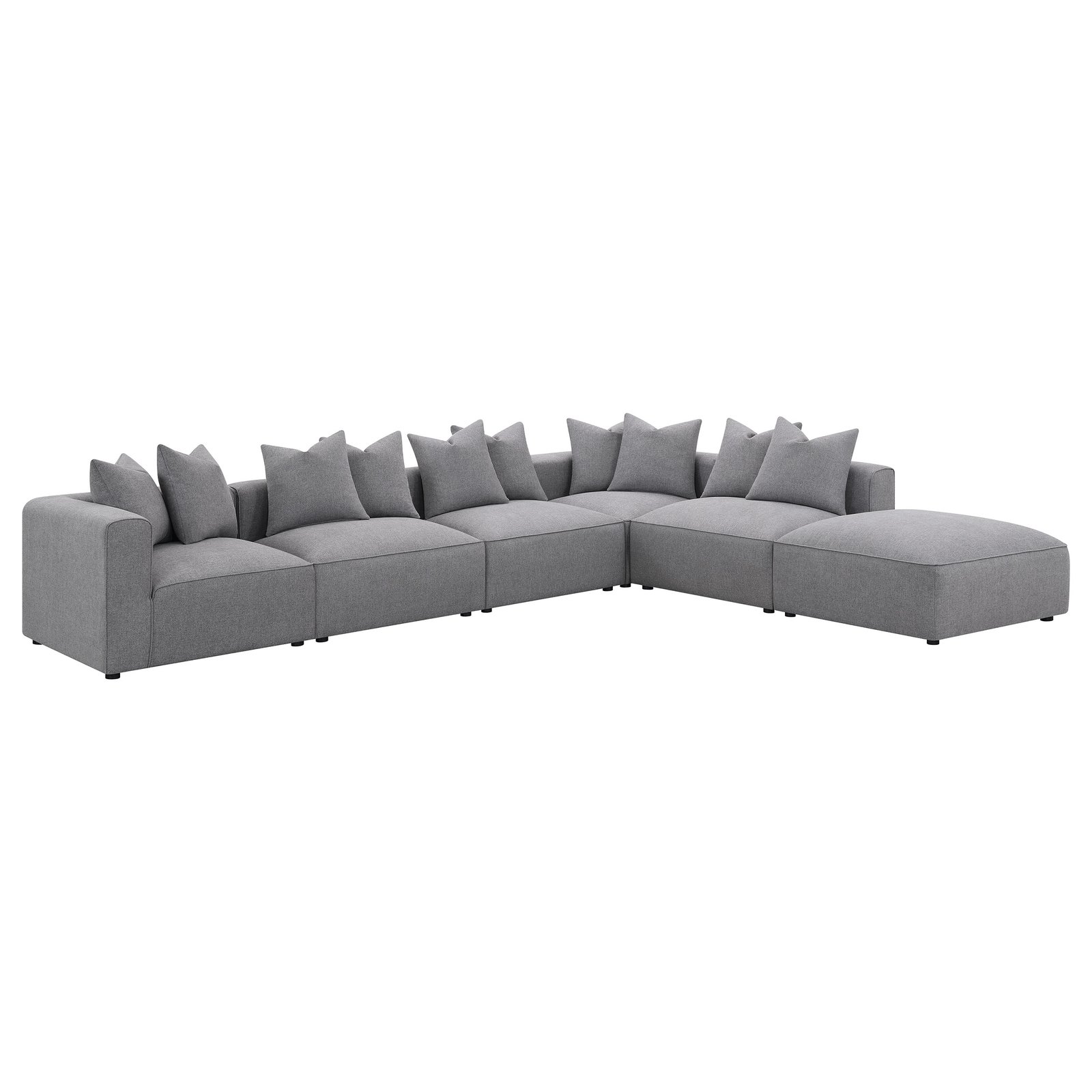 Gather around this large sectional sofa, featuring six modular pieces that invite you to rearrange it as needed for company and parties. Thick wide bases with waterfall edge-like profiles are accented with welt trim for a sleek tailored aesthetic. Perfect for accompanying your existing decor, the softly textured grey woven fabric offers a neutral and monochromatic color palette, welcoming fellow neutrals or adding a backdrop to vibrant colors. Matching pillows make up the back cushions, leaning back into track style armrests and backs. An ottoman easily transitions from a chaise lounge to a coffee table instantly.