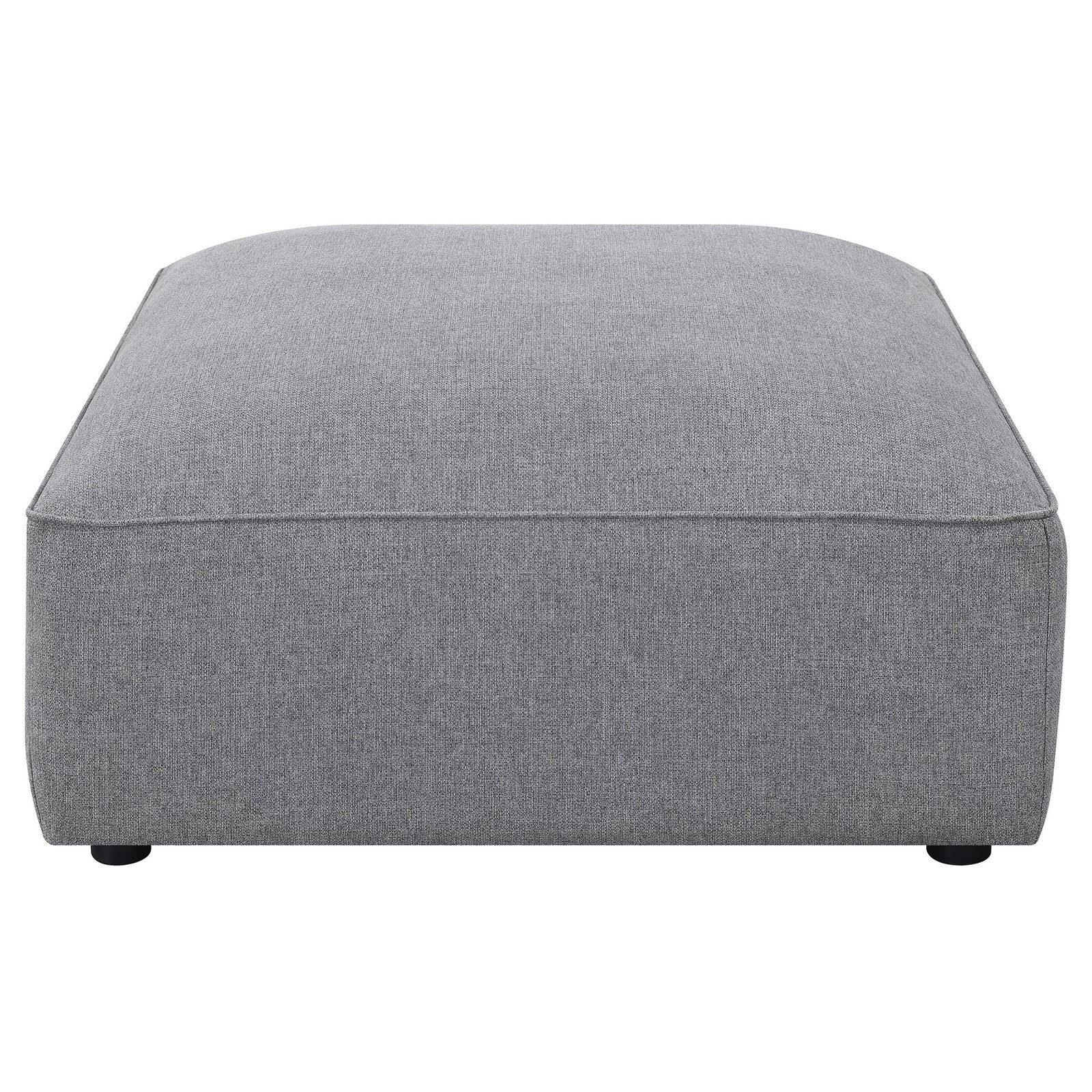 Introduce versatility and comfort with this oversized ottoman, designed to complement sectional seating or serve as a standalone accent piece. Upholstered in soft grey woven fabric, it offers a neutral tone that blends seamlessly with any modern interior. A large, smooth cushion top outlined with welt trim provides a tailored finish, while plush foam ensures comfort. Discreet black legs with non-skid grips add stability, making this ottoman ideal as a coffee table, footrest, or chaise extension.