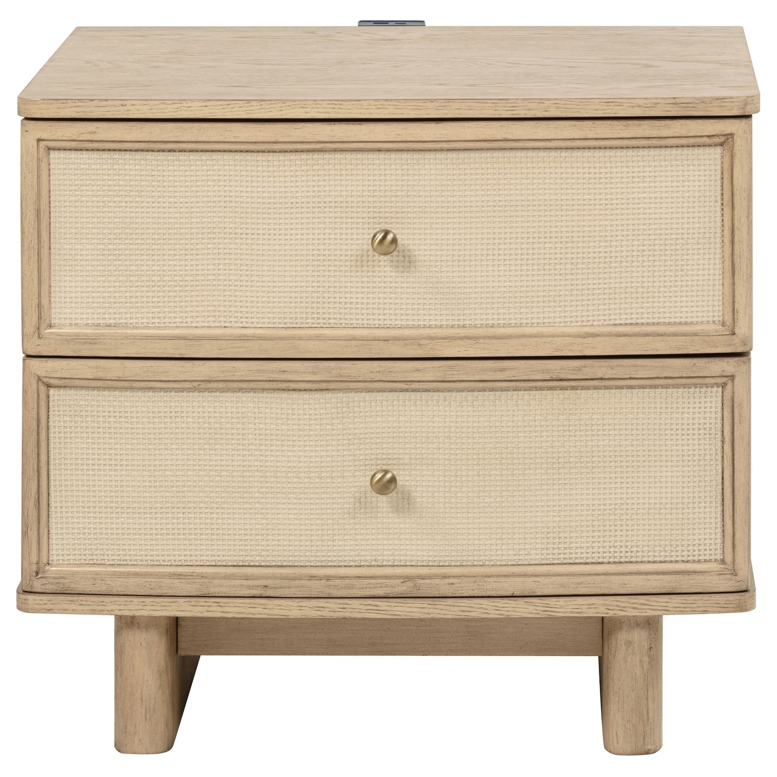 • Two-drawer nightstand with integrated charging ports, • Antique brass hardware complements the beige oak finish, • Smooth metal extension glides for easy drawer operation, • USB and Type-C charging ports in nightstand provide modern convenience, • Crafted with solid poplar, engineered wood, oak veneer, and resin cane