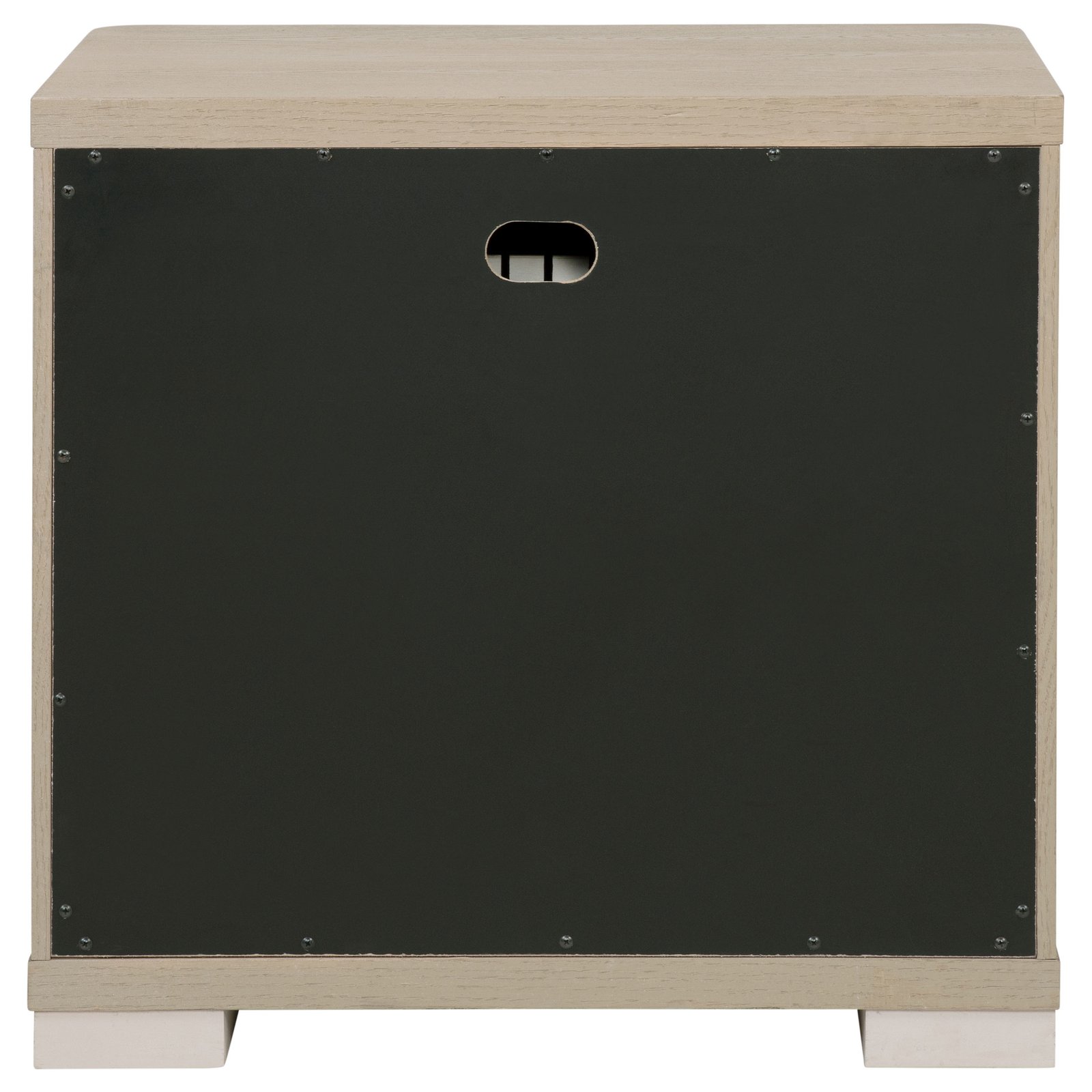 • Contemporary nightstand with a light elm finish for a clean and elegant look, • Two spacious drawers with tinted interiors provide generous bedside storage, • Top drawer lined with soft gray felt for a luxurious feel and added protection, • Brushed nickel fingertip pulls add subtle sophistication to the sleek design, • Built-in cord management simplifies recharging electronics without clutter, • Crafted with durable materials for reliable and lasting use in your bedroom