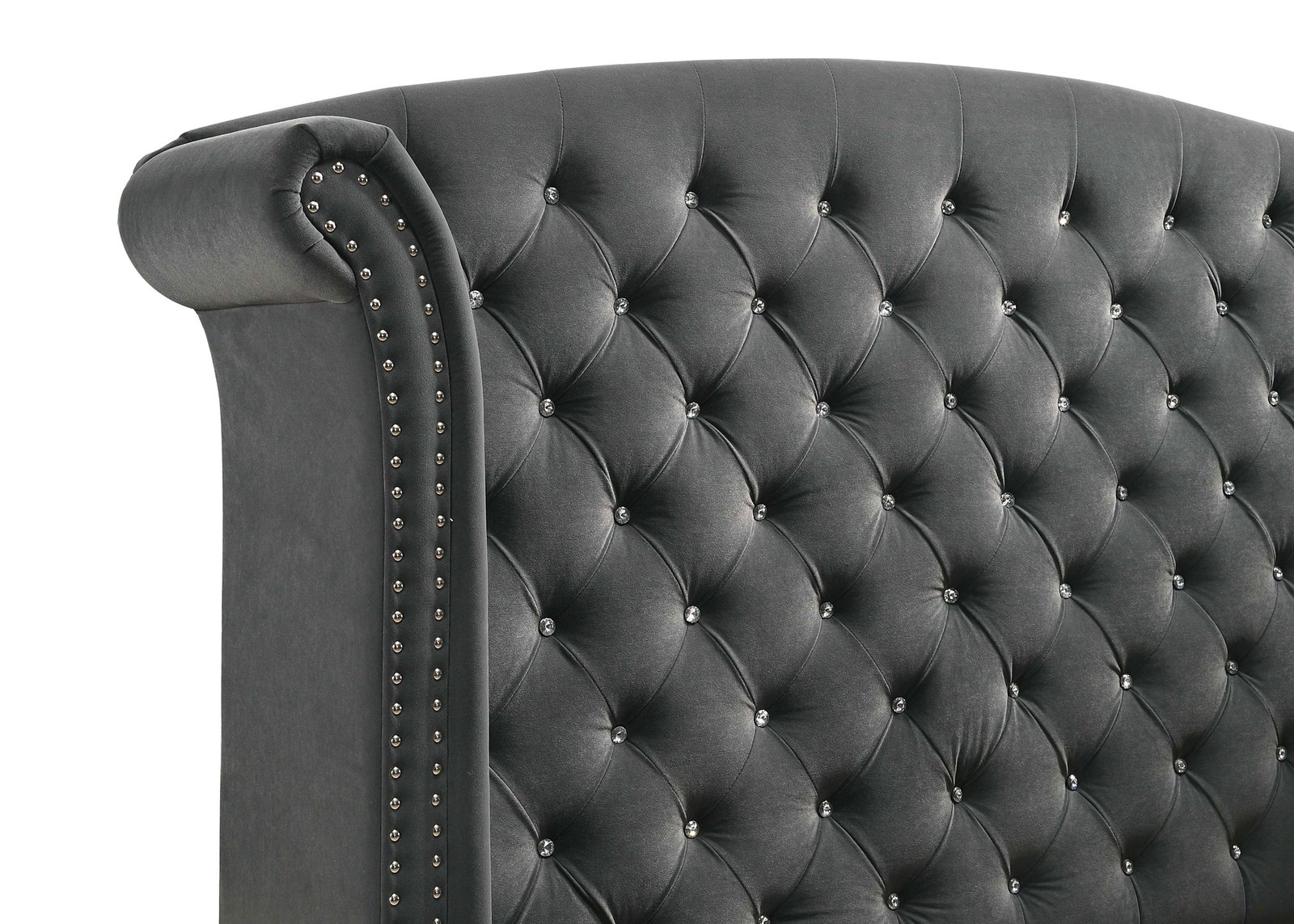 • Upholstered panel bed with oversized wingback headboard for visual impact, • Soft grey velvet upholstery with acrylic button tufting and nailhead trim, • Headboard features hand-applied chrome nailheads for elegant detail, • Requires a box spring foundation for proper mattress support, • Chrome-finished metal legs elevate the low-profile footboard frame, • Crafted from engineered wood, foam padding, and plush matte velvet