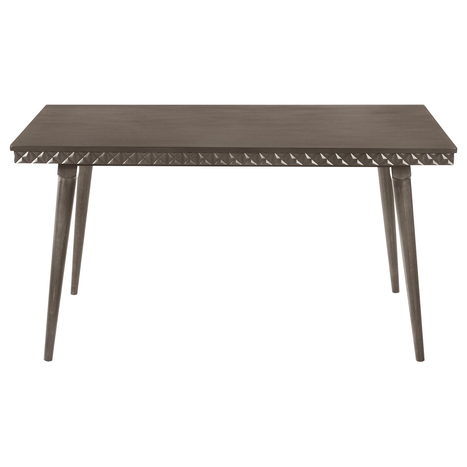 Introduce modern elegance to your dining room with this stunning 59-inch dining table. Its distinctive design features intricate detailing along the apron, adding a textural contrast to the smooth tabletop. Constructed with a blend of solid wood, engineered wood, embossed mdf, and okume veneer, this table ensures both durability and style. The dark brown finish enhances its sleek, sophisticated appearance, making it a focal point in any dining space. Tapered legs add a mid-century touch while maintaining a contemporary appeal, perfect for modern or transitional homes.