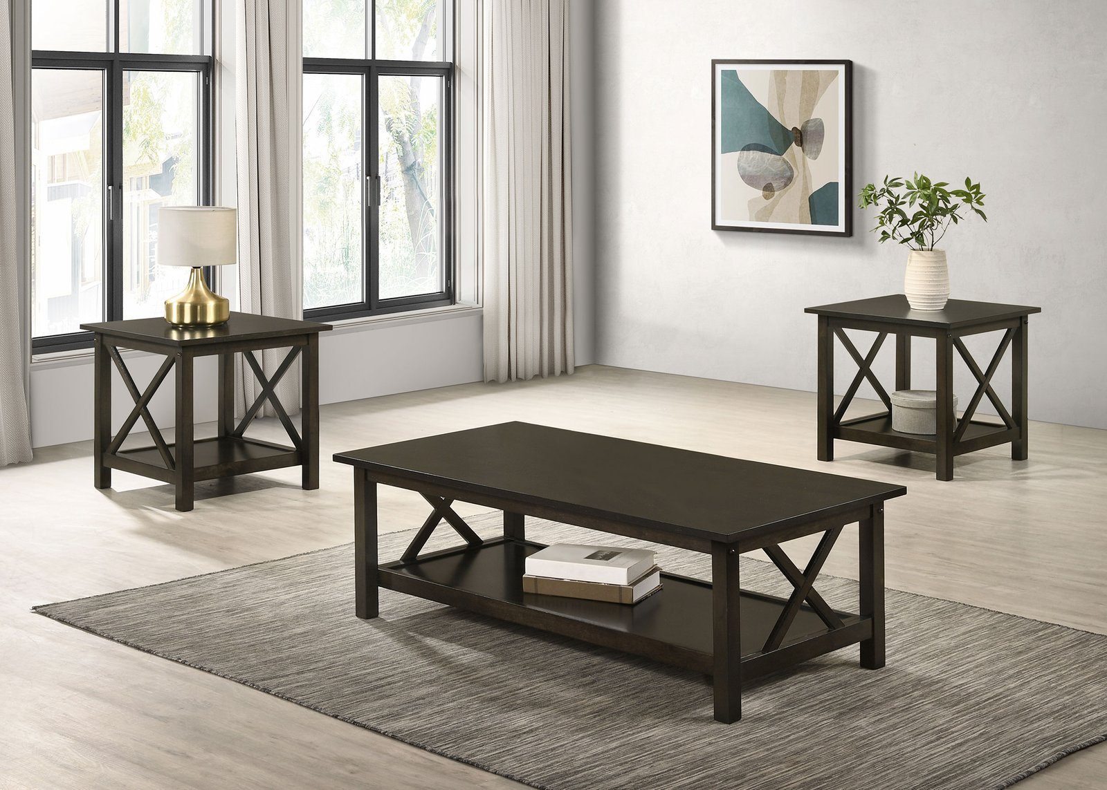 This 3-piece occasional table set includes a coffee table and two end tables, ideal for a living room or lounge. Constructed from hardwood, engineered wood, and rubberwood veneer, this set showcases a rich dark merlot finish. Each piece is designed with a lower shelf for extra storage space, while the X-shaped accents on the sides add a touch of visual appeal. This coffee table set is a perfect combination of form and function for your home.
