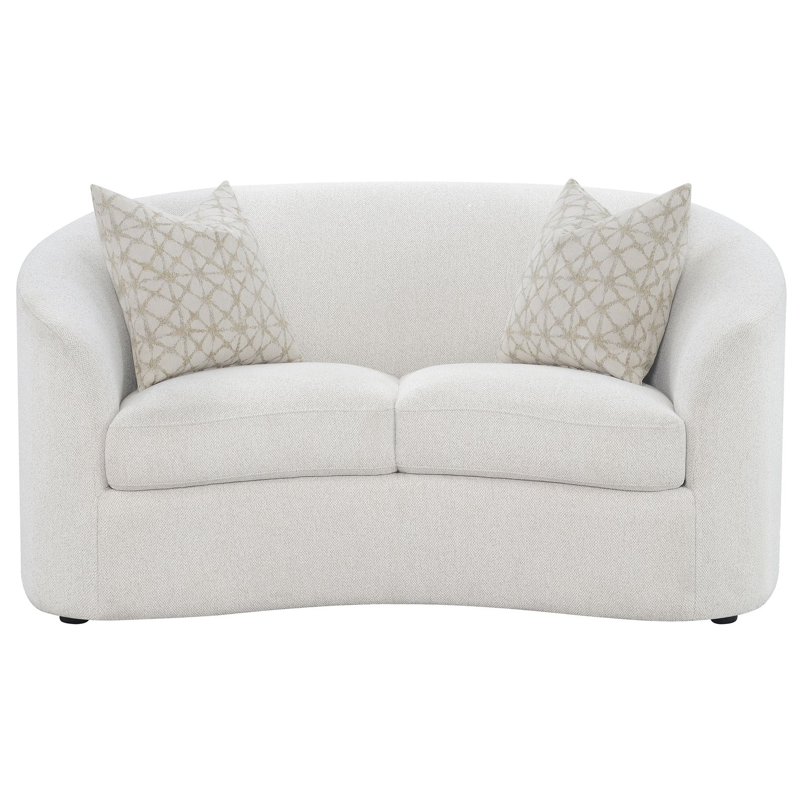 • Three-piece sofa set upholstered in soft latte boucle for texture, • Graceful curved silhouettes bring mid-century inspired sophistication, • Plush cushions and tailored backs deliver lasting comfort and support, • Sloped armrests and rounded edges enhance modern organic form, • Accent pillows with faux down fill add warmth and decorative charm, • Perfect for spacious living rooms with modern transitional appeal