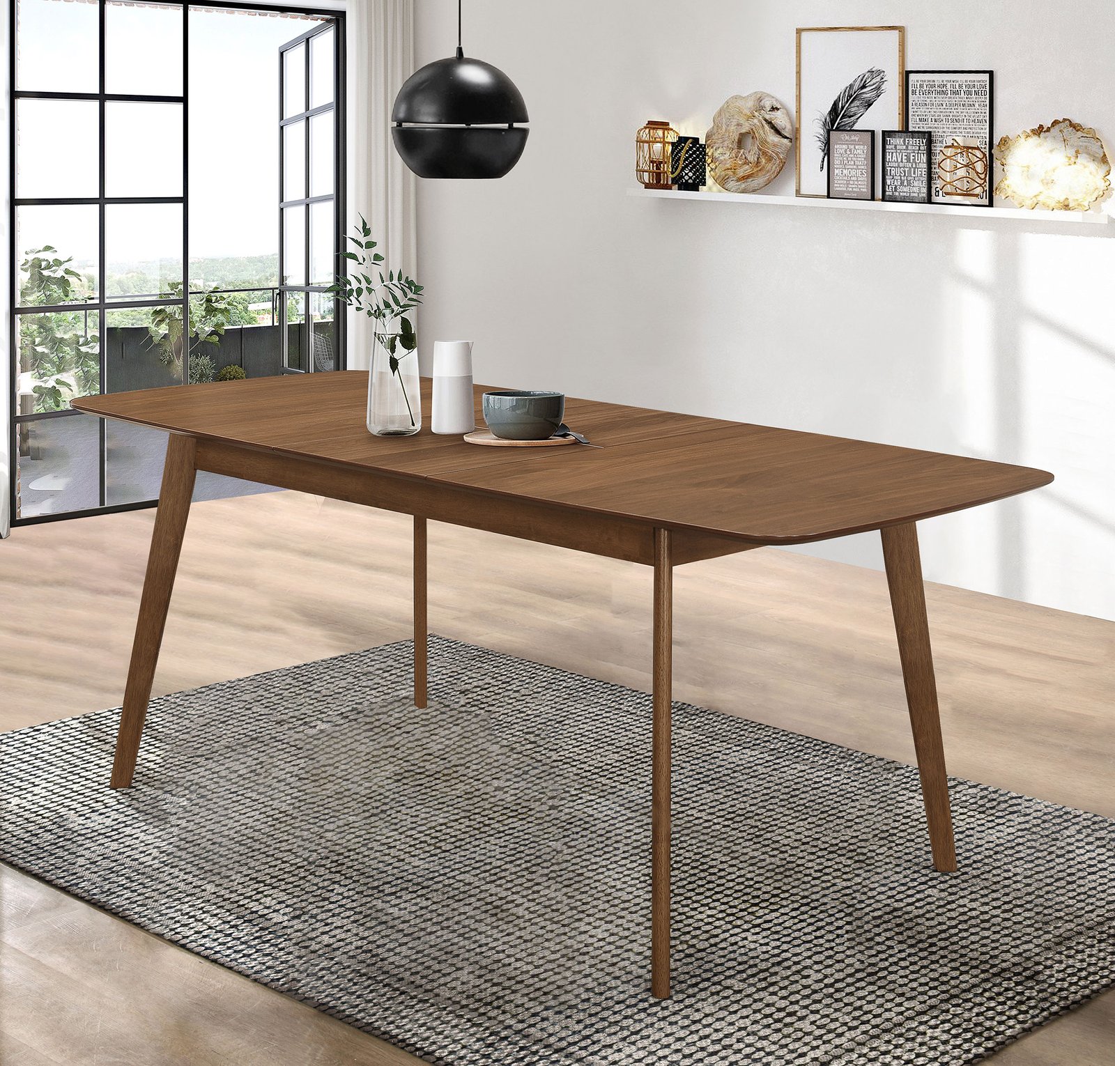 • Dining table features a clean mid-century modern design with refined details, • Crafted from durable rubberwood with a warm walnut veneer finish, • 16-inch butterfly leaf expands table length up to 75 inches for guests, • Reverse beveled tabletop with rounded corners adds a tailored touch, • Slim tapered legs provide stability and an elegant minimalist profile, • Perfect centerpiece for contemporary or transitional dining settings