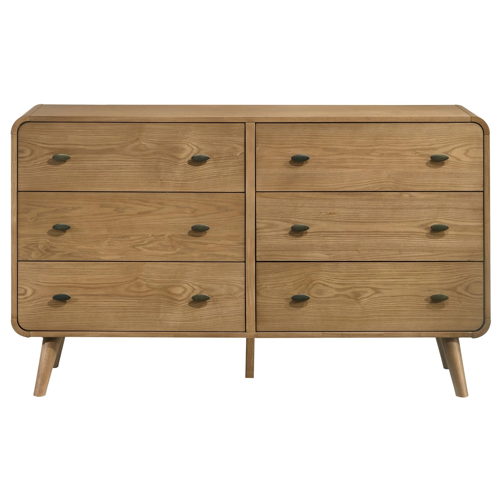 Keep your space neat and organized with this sleek mid-century modern dresser, built with rubberwood, engineered wood, and ash veneer for durability. Featuring six spacious drawers, it offers ample storage for clothing and accessories. Rounded edges and tapered legs exude retro charm, while the felt-lined top drawers add functionality for storing delicate items. The clean, modern silhouette is perfect for enhancing any bedroom’s aesthetic.