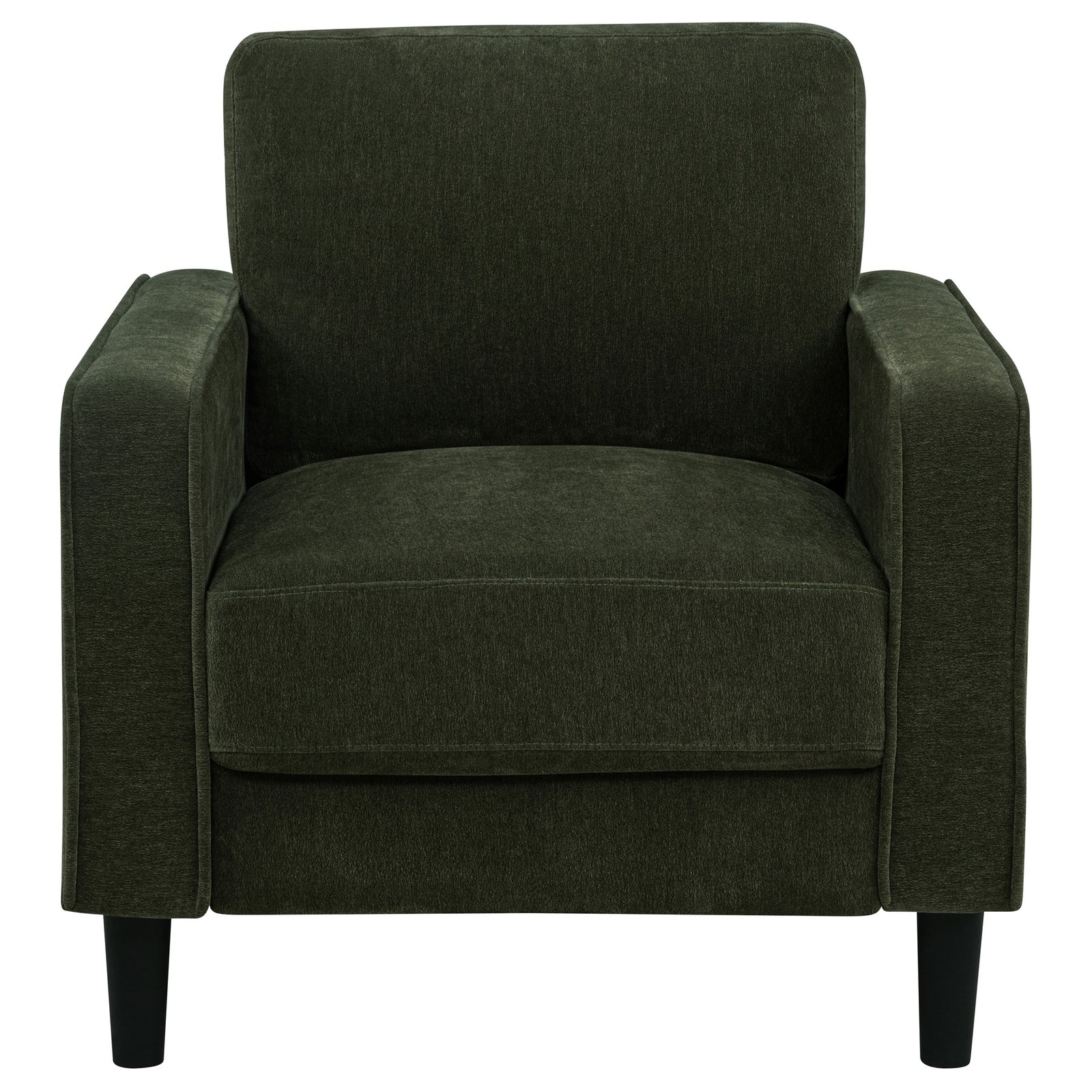 Compact and clean-lined, this armchair delivers modern simplicity with soft comfort. Framed by slim track arms, the seat features plush foam cushions for lasting support. Tapered legs and subtle piping refine its silhouette, while the tailored upholstery adds understated texture. Ideal for small spaces, reading corners, or as a companion to matching seating, this chair brings quiet structure to any contemporary room.