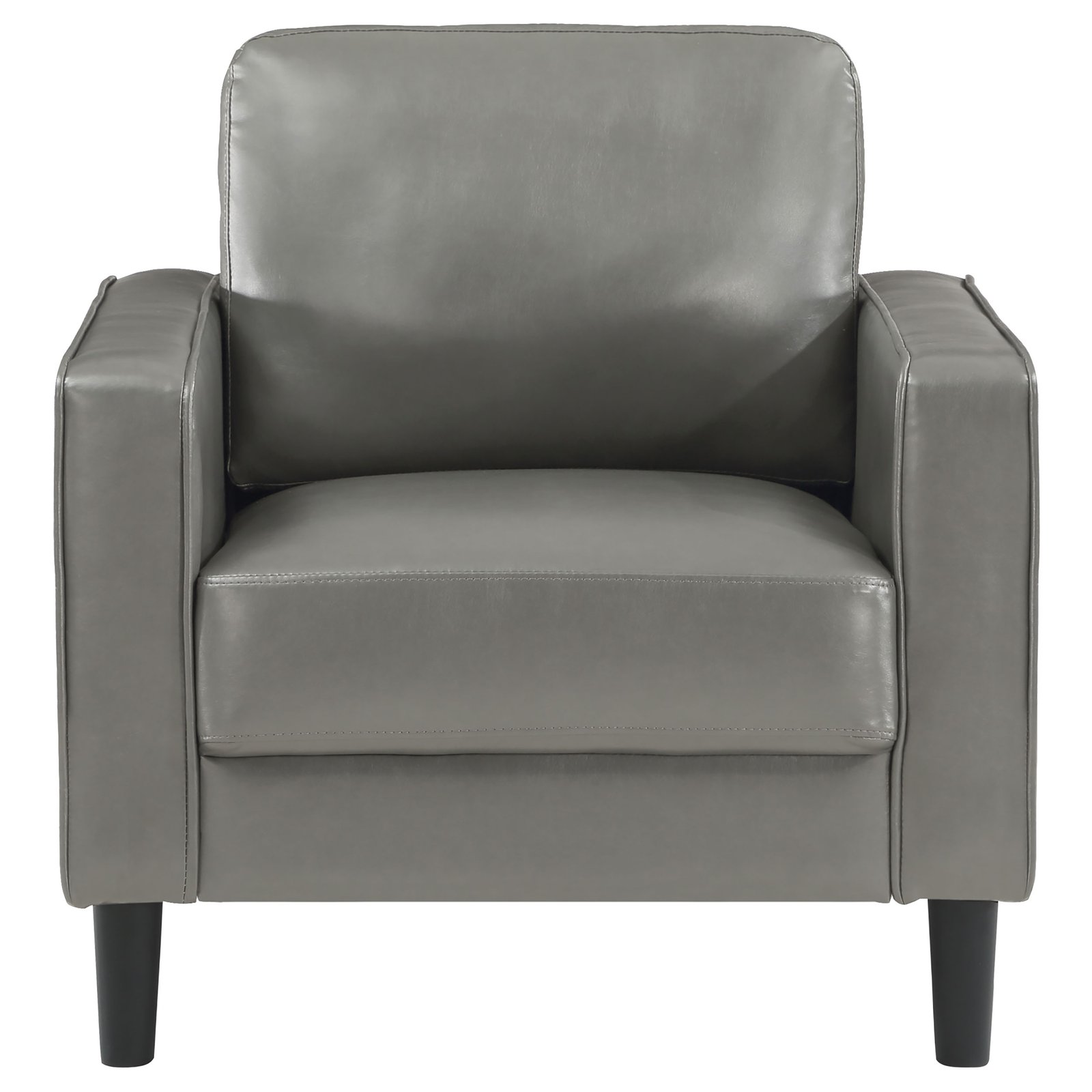 • Contemporary accent chair with a streamlined, compact design, • Grey faux leather upholstery adds a bold, modern touch to any space, • Padded seat and back cushions ensure a supportive and cozy feel, • Slim track arms contribute to a refined and stylish appearance, • Tapered wooden legs provide excellent stability and lasting durability, • Versatile as a standalone accent piece or part of a full seating set