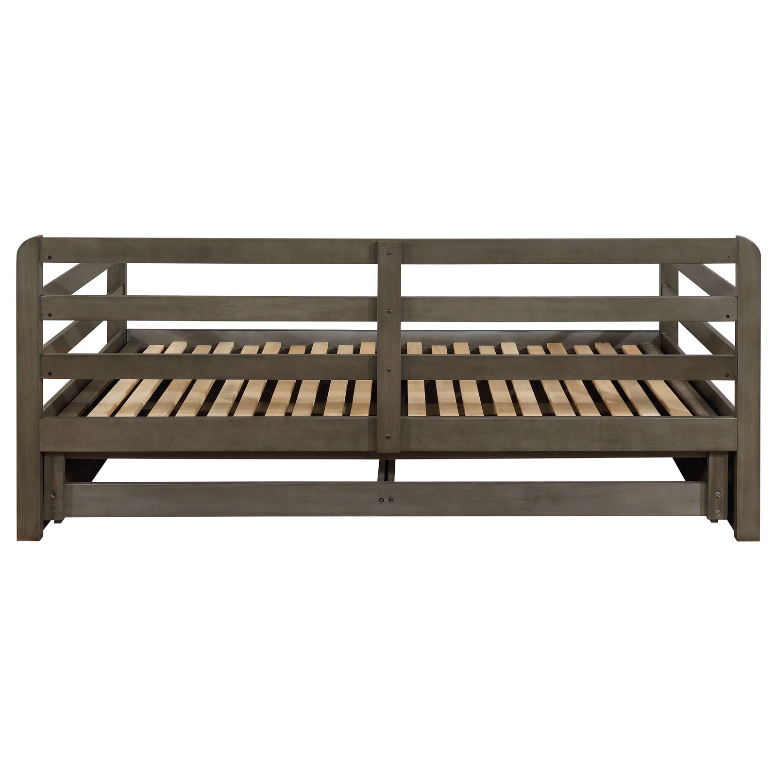• Rustic twin XL daybed with trundle in grey finish, • Trundle extends to accommodate second twin mattress (6” mattress recommended), • Trundle includes two (2) storage drawers, • Pine, plywood, and MDF construction, • Slat kits included