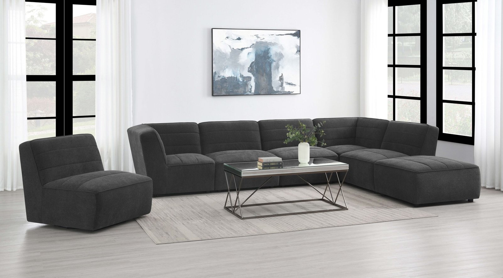 • Style: Contemporary, • Fabric Color: Dark Charcoal, • Leg Color: Black, • Upholstery: Boucle, • Fabric Content: Polyester 100% , • Cleaning Code: WS, • Overall Weight Limit: 300 Lbs, • Assembly Required: Yes, • Materials: Fabric, Foam, Larch, Plastic, Plywood
