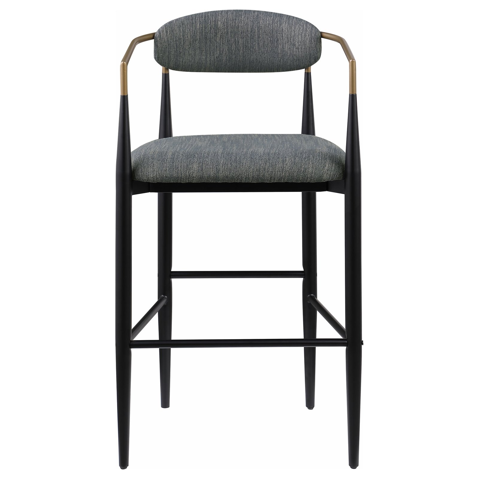 Take your kitchen or dining room decor to stylish new heights with the mid-century flair of a set of two modern barstools. Each offers an airy, open silhouette with its pairing of a plush seat and slender backrest, both with foam cushioning and stylish upholstery. The gentle curvature of the seatback continues in slim arms that receive a medium brown finish that complements both the fabric and the black finish of the base. The base of each barstool offers tapering legs and slim support bars that create a built-in footrest for added comfort and support. This plush barstool is the ideal solution to a bar table in a relaxed dining room or a home lounge in need of elevated style.