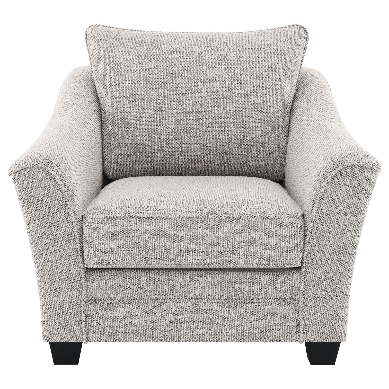 • Sink into the comfort of a modern accent armchair with plush cushions, • Multi-dimensional gray boucle upholstery is textured and rich in any space, • Gently flared, sloping arms add depth and stylish appeal to a classic silhouette, • Plush cushions feature foam construction for optimal comfort and support, • Tapering block legs feature plastic glides to protect flooring underneath