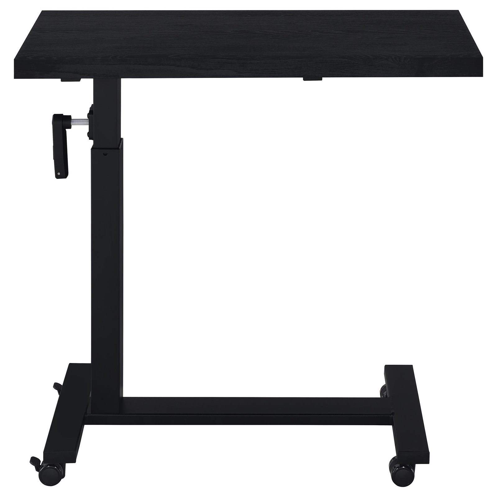 • Height-adjustable C-table with a 27-39 inch range, • 28-inch wide black oak-inspired top ideal for bedroom use, • Smooth hand-crank mechanism for precise adjustments, • Heavy-duty steel base with a matte black powder-coated finish, • Spacious surface for working, dining, or reading in bed, • Sturdy and reliable design tailored for bedside convenience